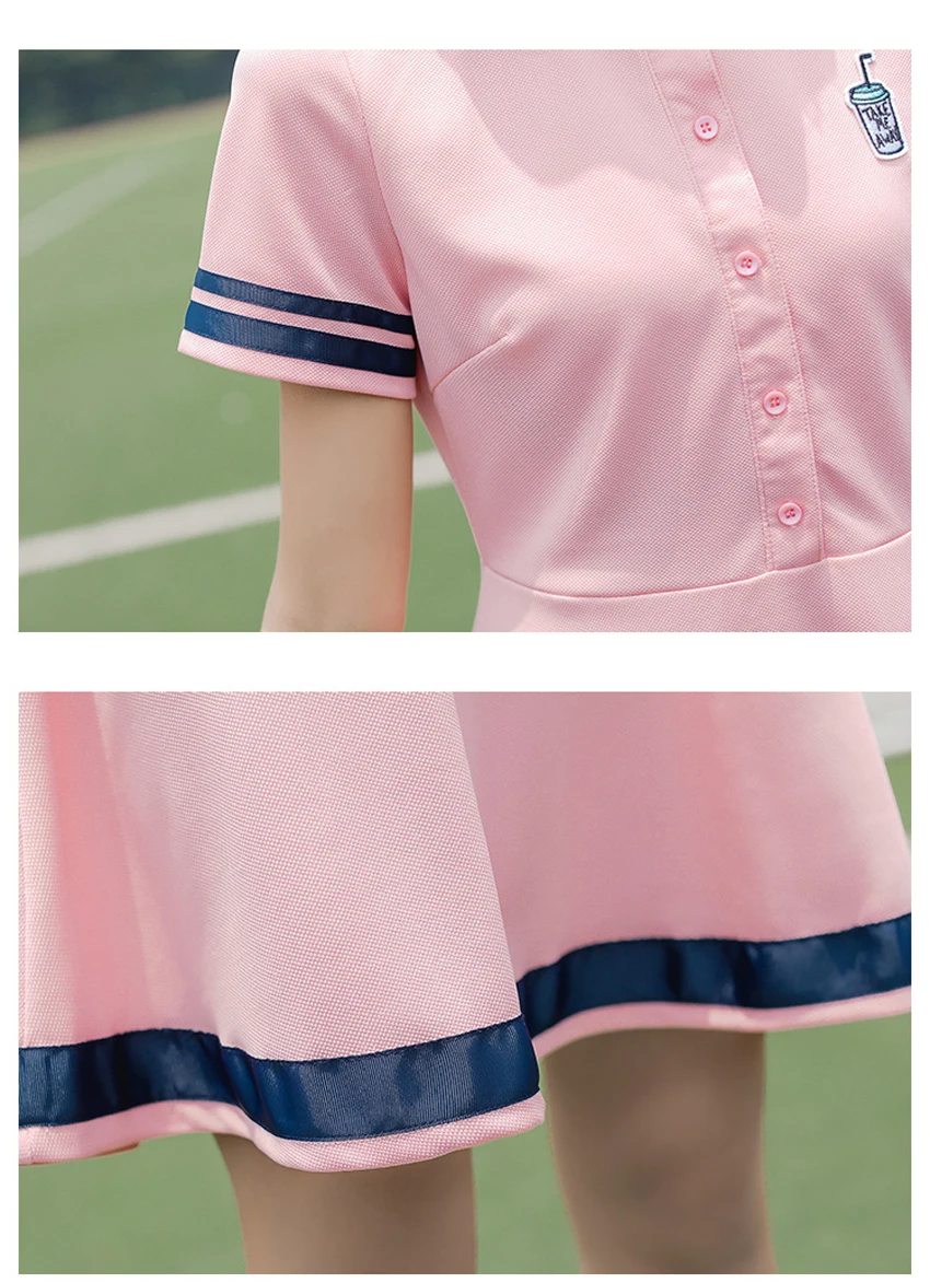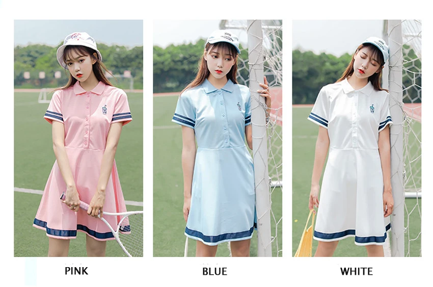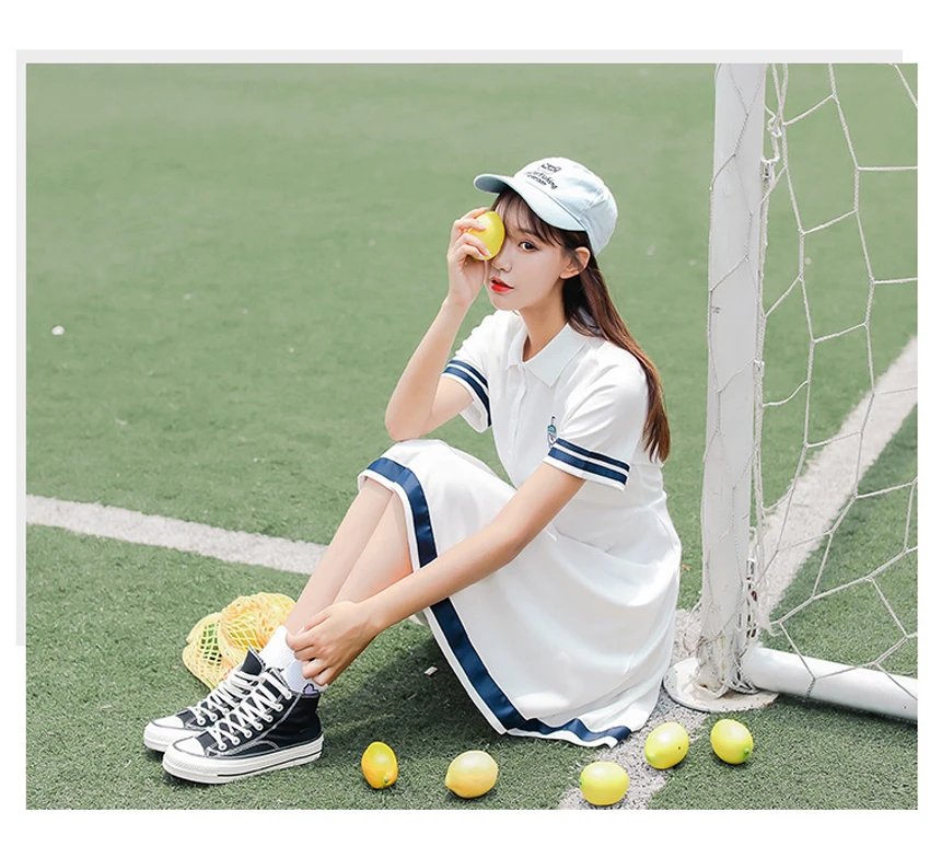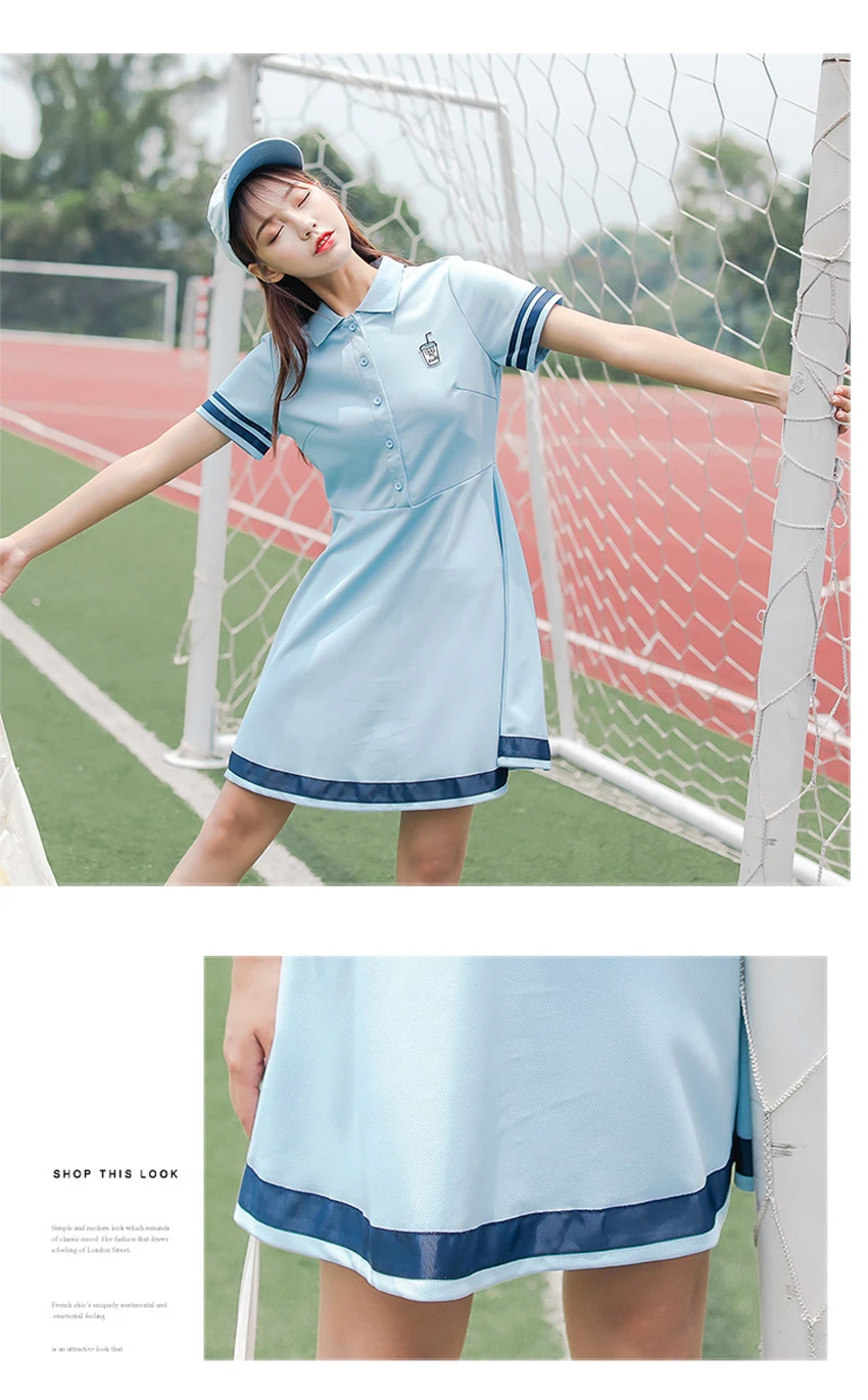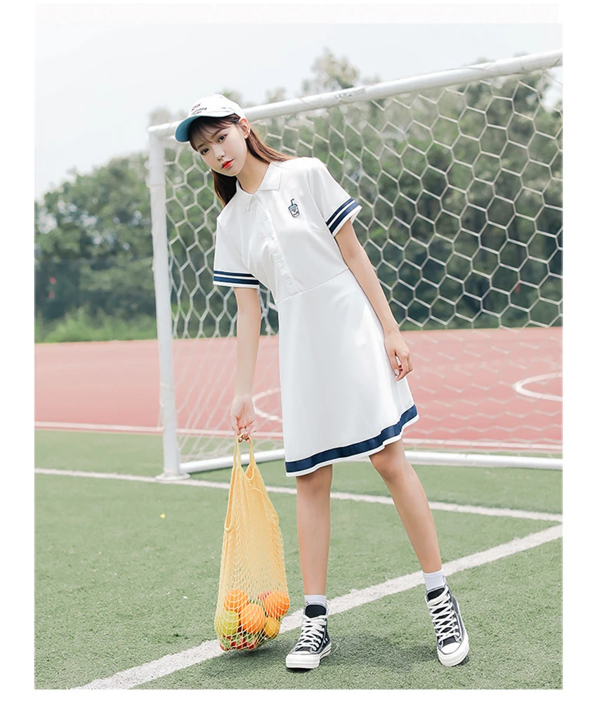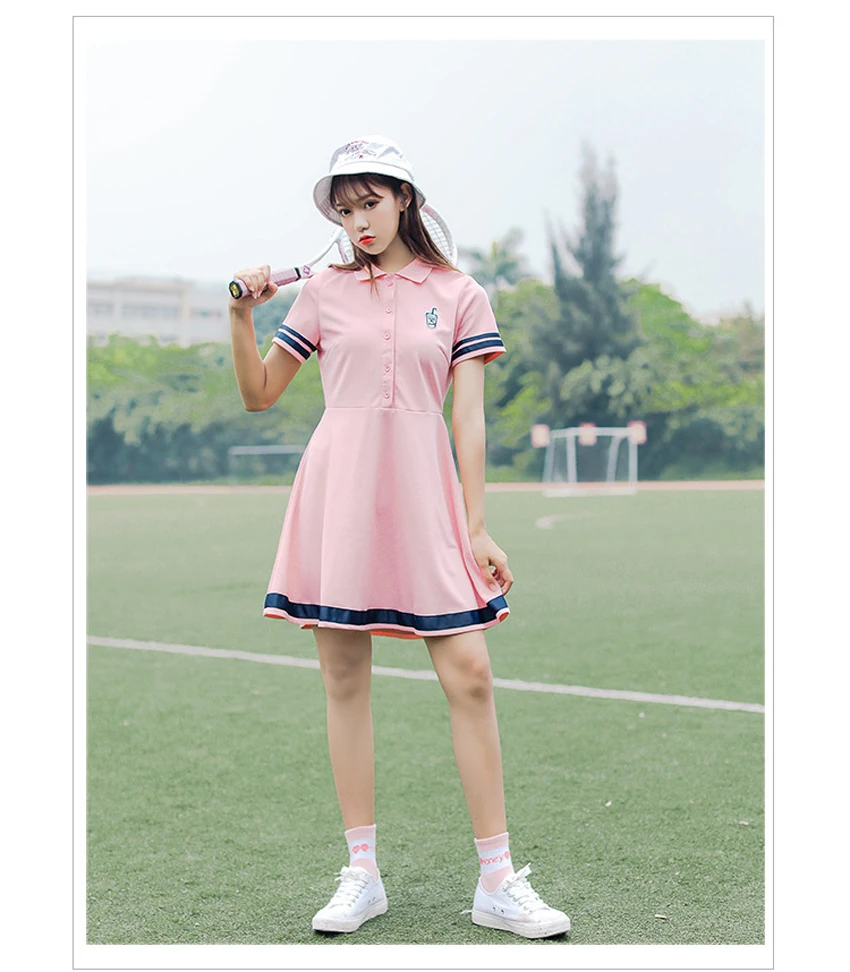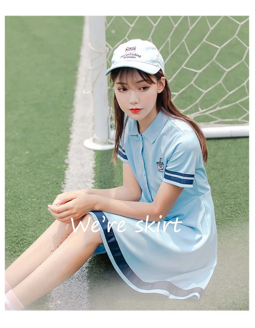 Korean Sports Dress Button Collar Cotton Striped Badminton Polo T-Shirt Female Summer Girls High School Student Tennis Dresses