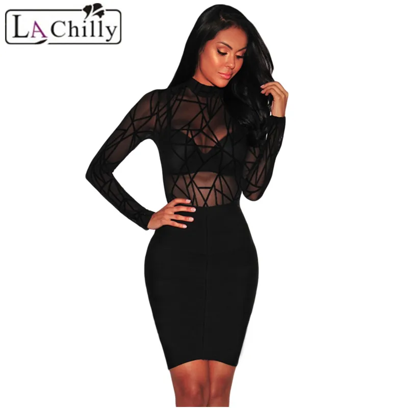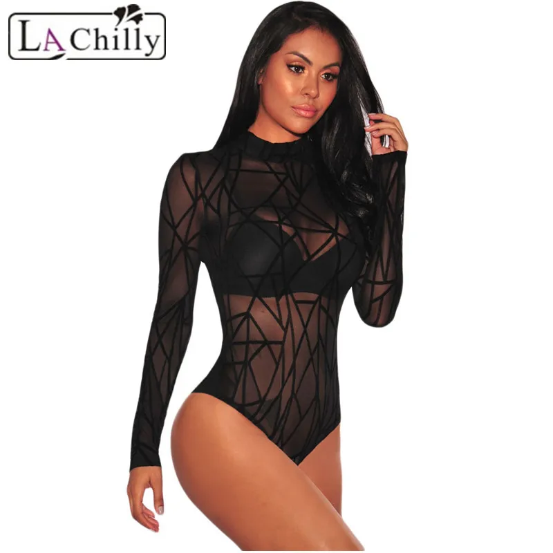 La Chilly 2018 Sexy Body Manche Longue Femme Long Sleeve Body Suits For Women Black Sheer Mesh Geometric Velvet Bodysuit LC32166