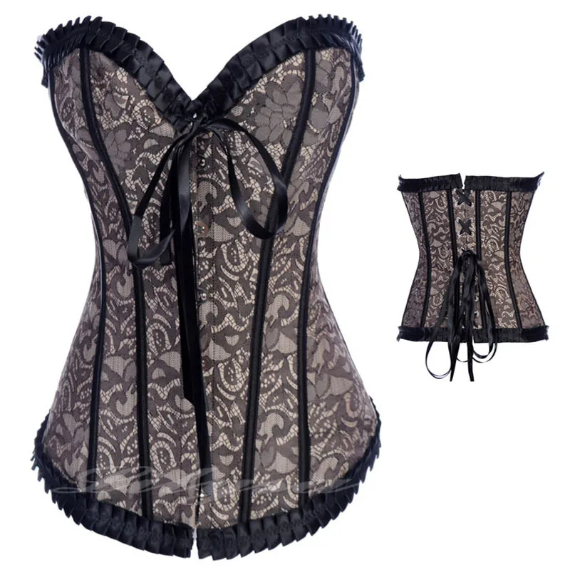 Lace UP Black Boned Overbust Corset Bustier Dress TOP Vintage Plum Brocade S M L XL 2XL N36