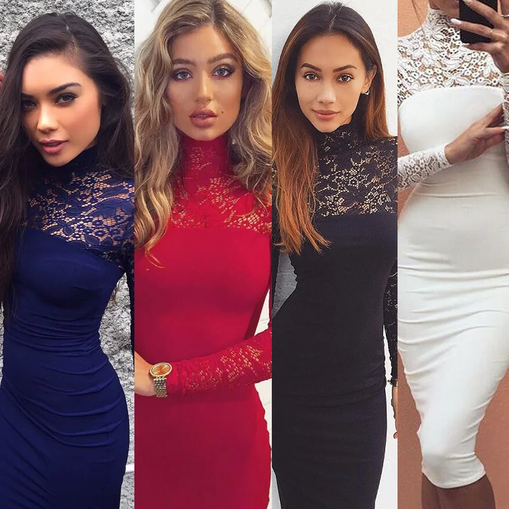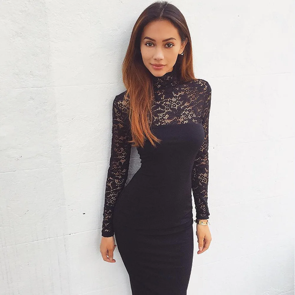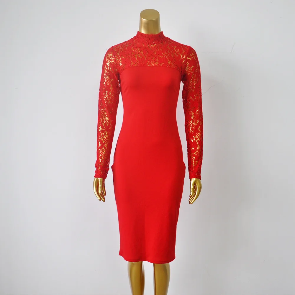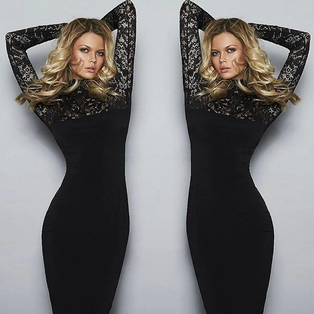 Lace Women Sexy Dress Tunic Maxi Bodycon Female Long Sleeves Spring Autumn Party Slim Dresses Elegant Lady Clothes Pure Colors