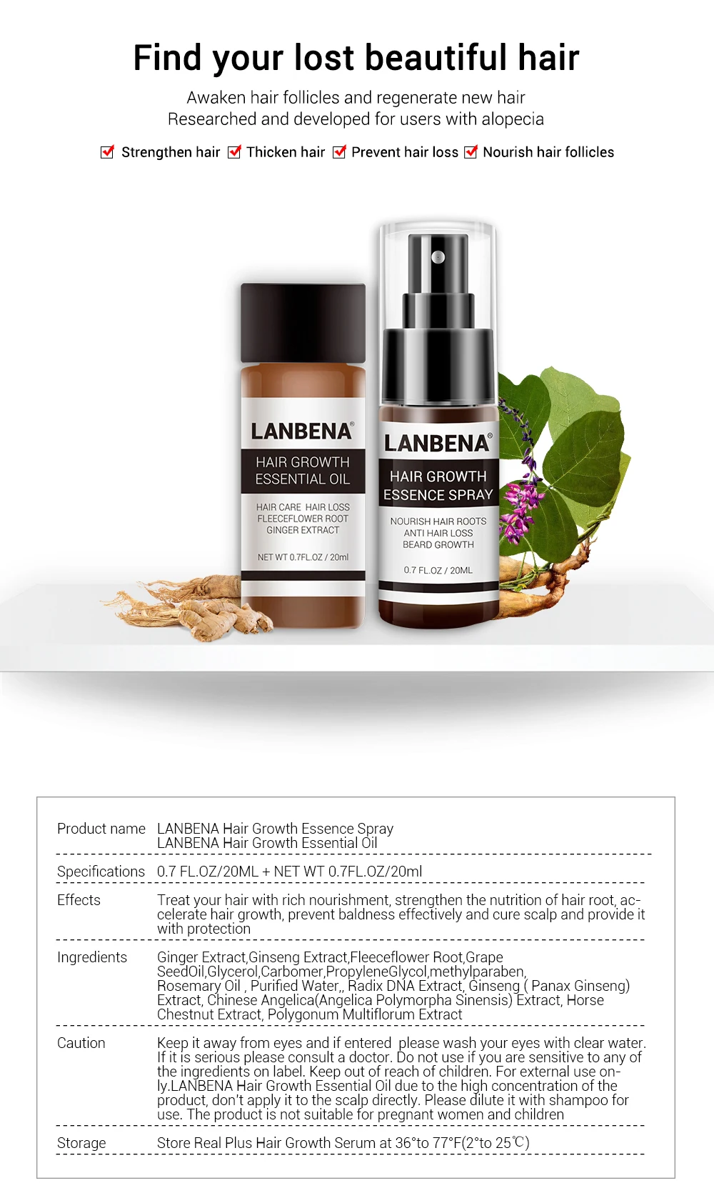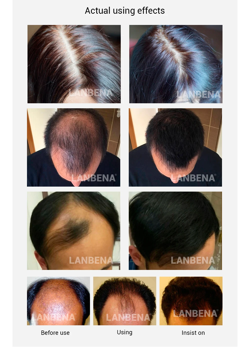 LANBENA hair growth spray and hair growth essence have the functions of accelerating blood circulation on scalp, enhancing the massiveness of hair follicles and hair roots, swelling hair roots, promoting melanin synthesis, mending hair quality, LANBENA GROWTH ESSENCE SPRAY (Strong Version) could also help you with the following ways, such as increasing hair elasticity, speeding up the hair growth and cleaning deposit dirty on sebum of pore thoroughly. LANBENA GROWTH ESSENCE SPRAY is effective to all kinds of hair-loss, alopecia areata and alopecia totalis. It is the most effectual herbal hair growth product.