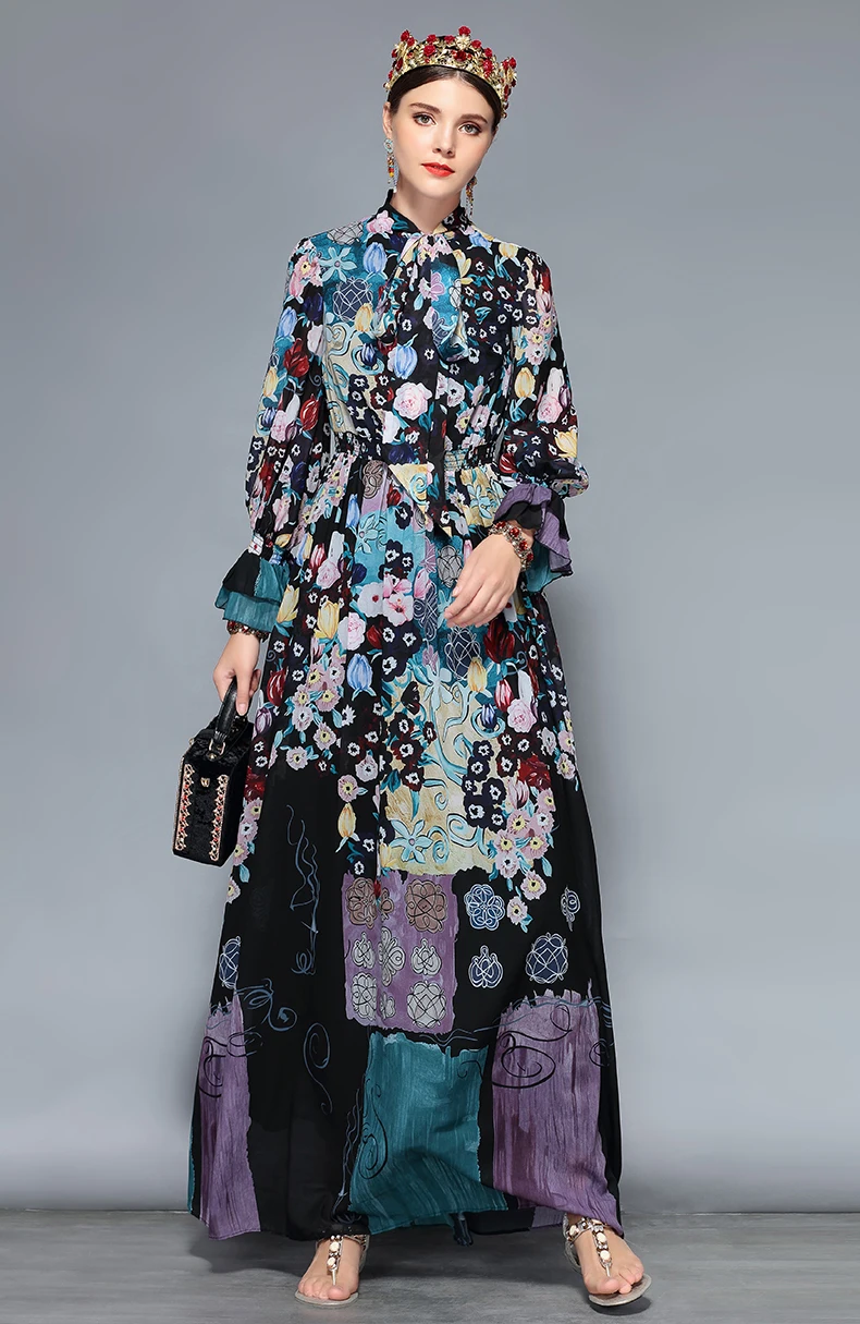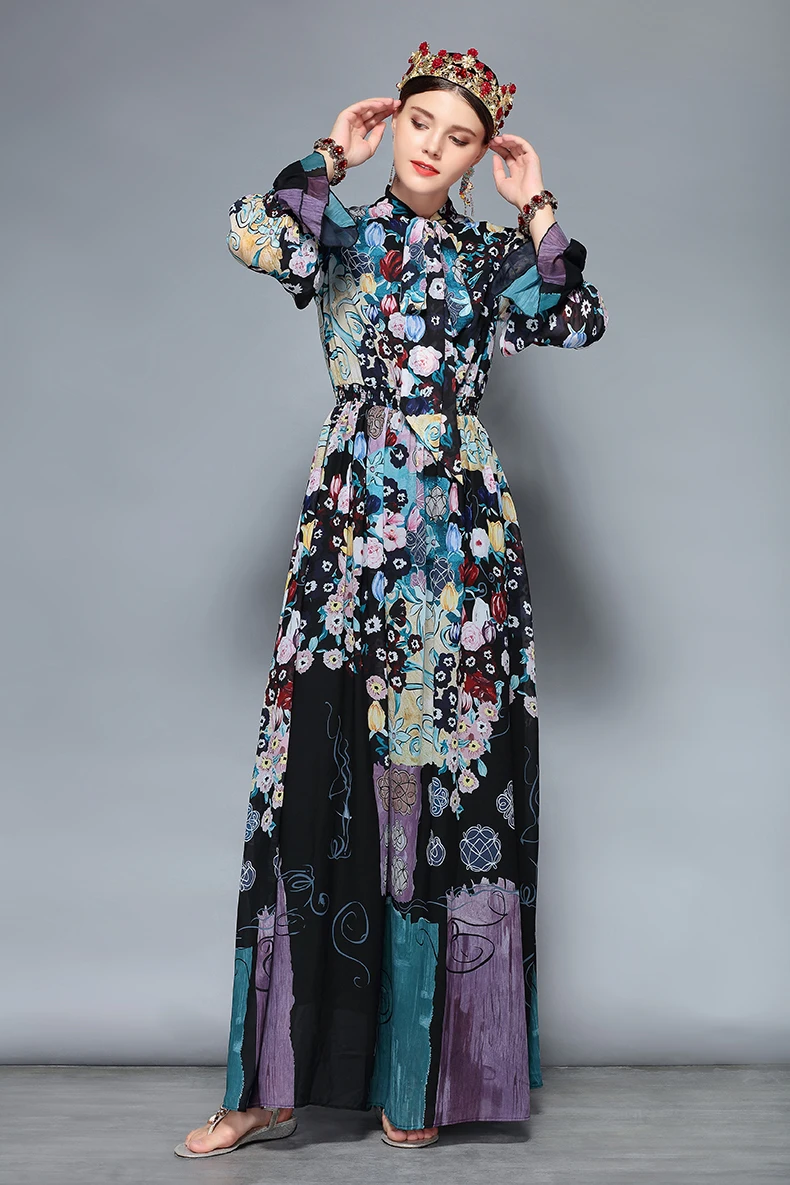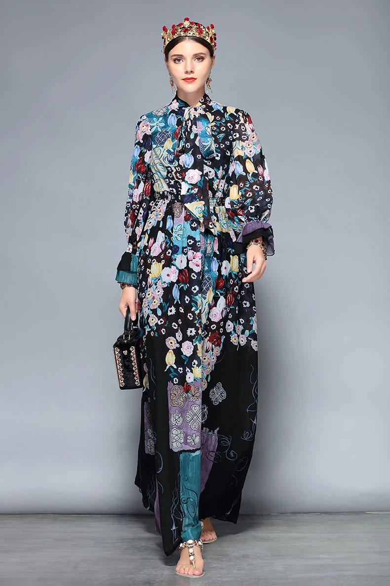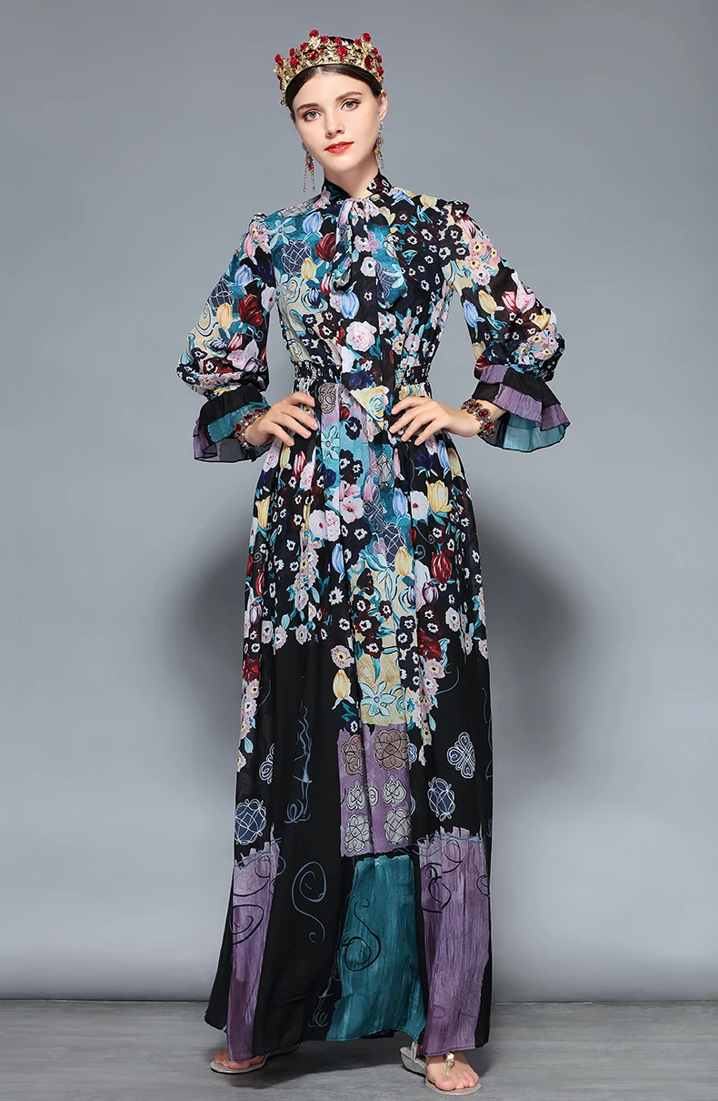LD LINDA DELLA New Fashion Runway Maxi Dresses Women’s Long Sleeve Bow Collar Chiffon Floral Print Vintage Long Party Dresses