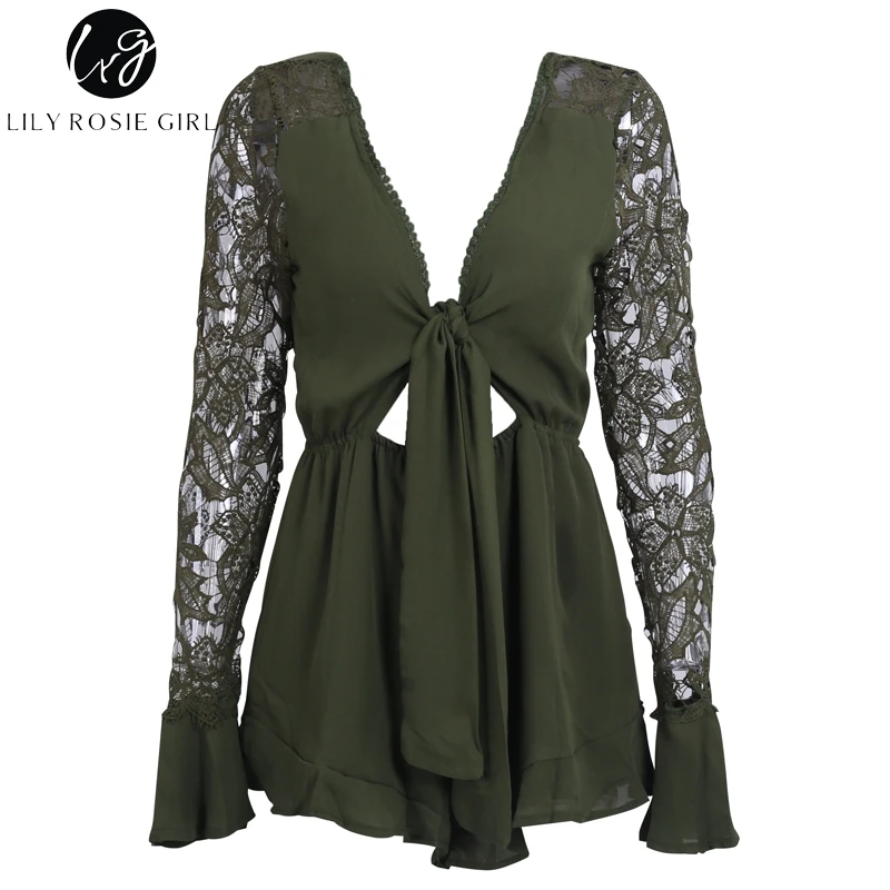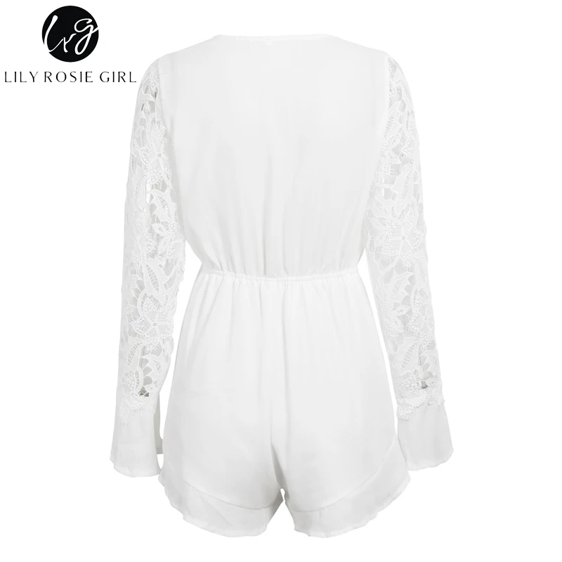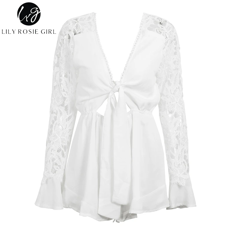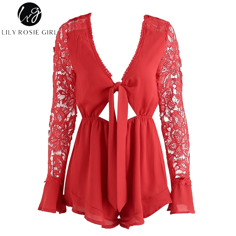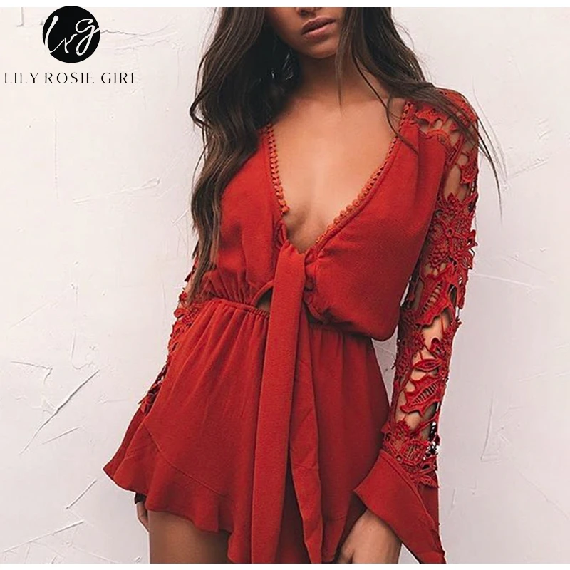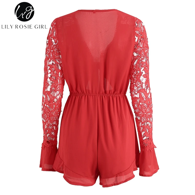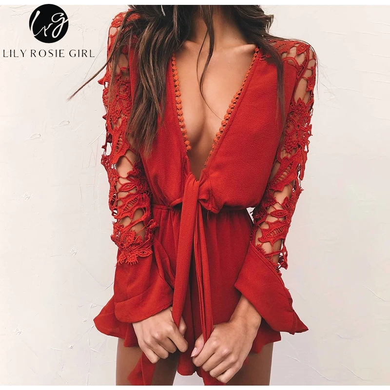 Lily Rosie Girl Deep V Neck Casual Red Crop Playsuit Beach Boho Sexy Long Sleeve Playsuit Lace Hollow Out Short Jumpsuit Rompers