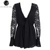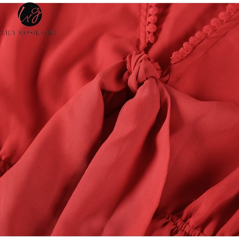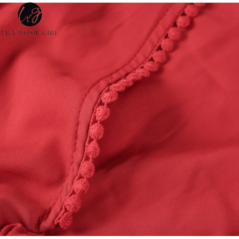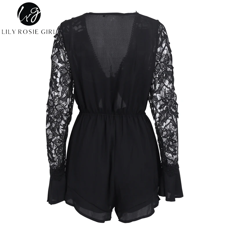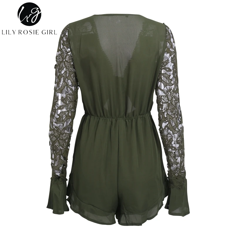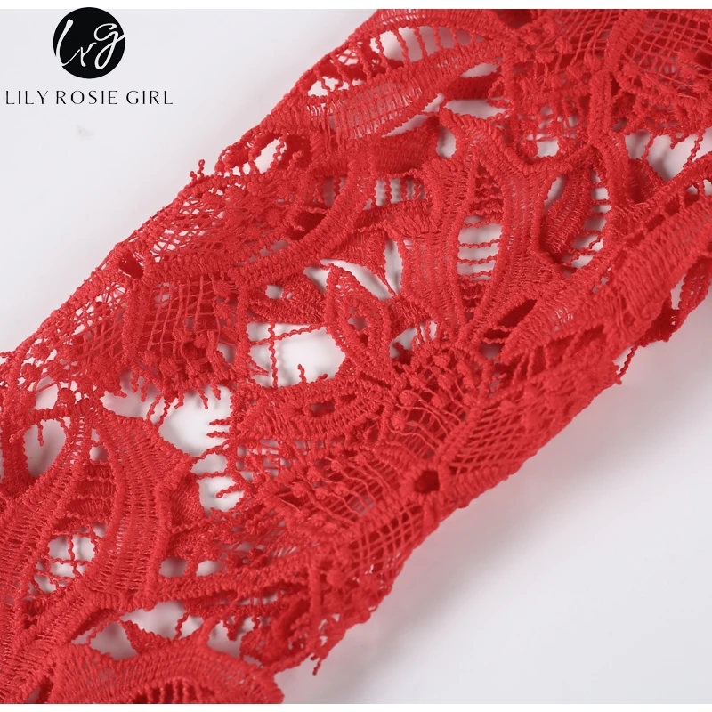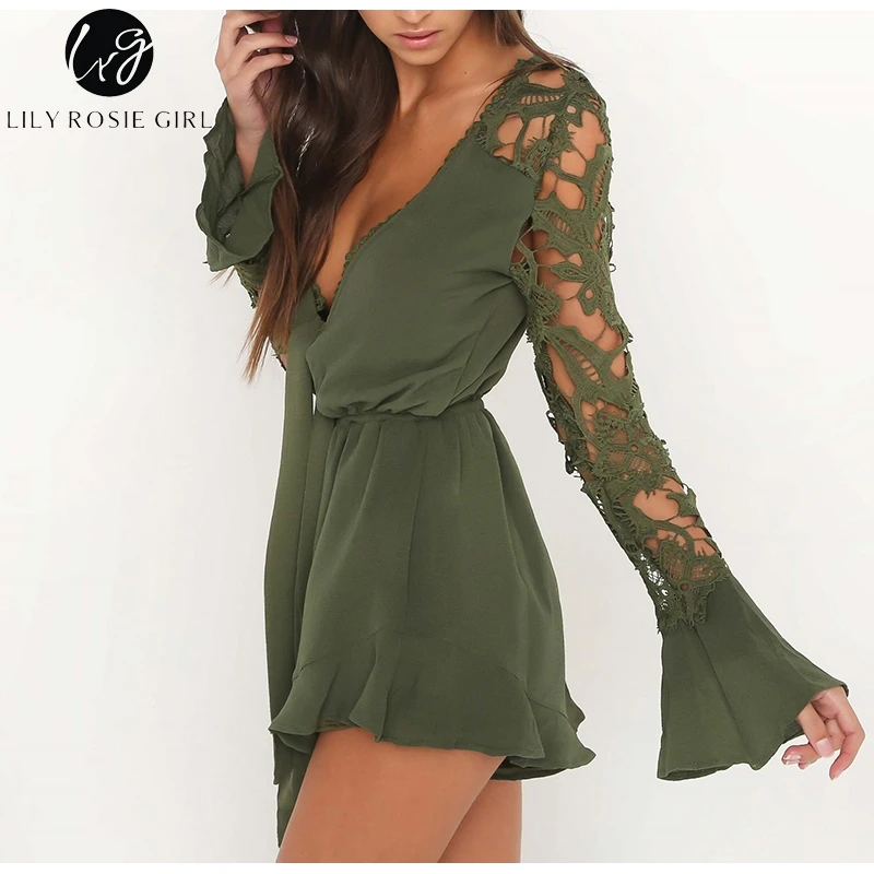 Lily Rosie Girl Deep V Neck Casual Red Crop Playsuit Beach Boho Sexy Long Sleeve Playsuit Lace Hollow Out Short Jumpsuit Rompers