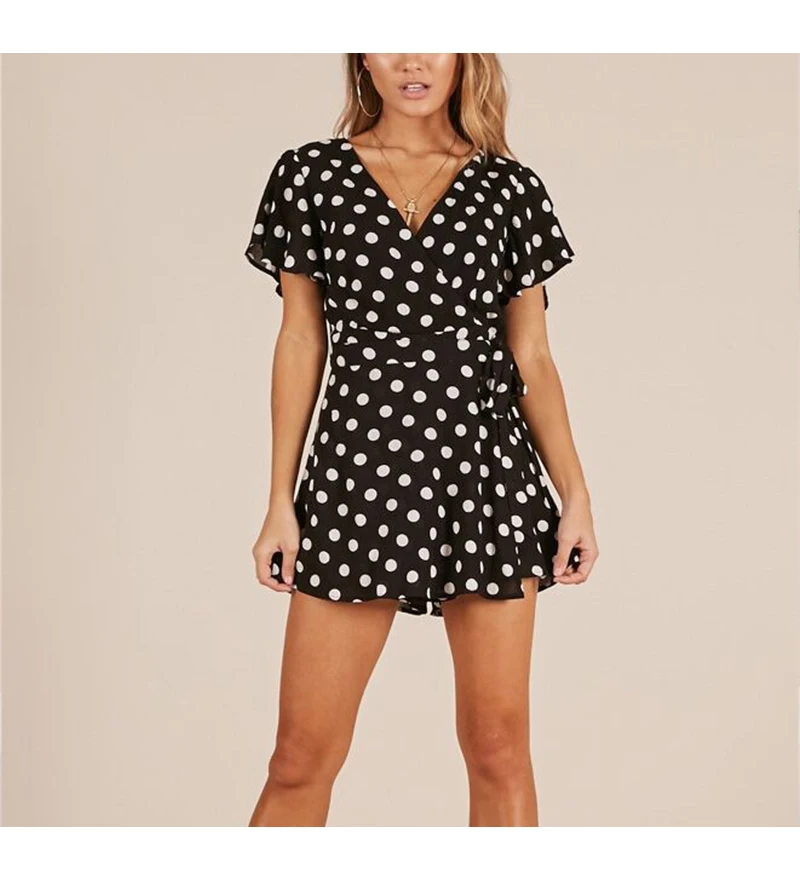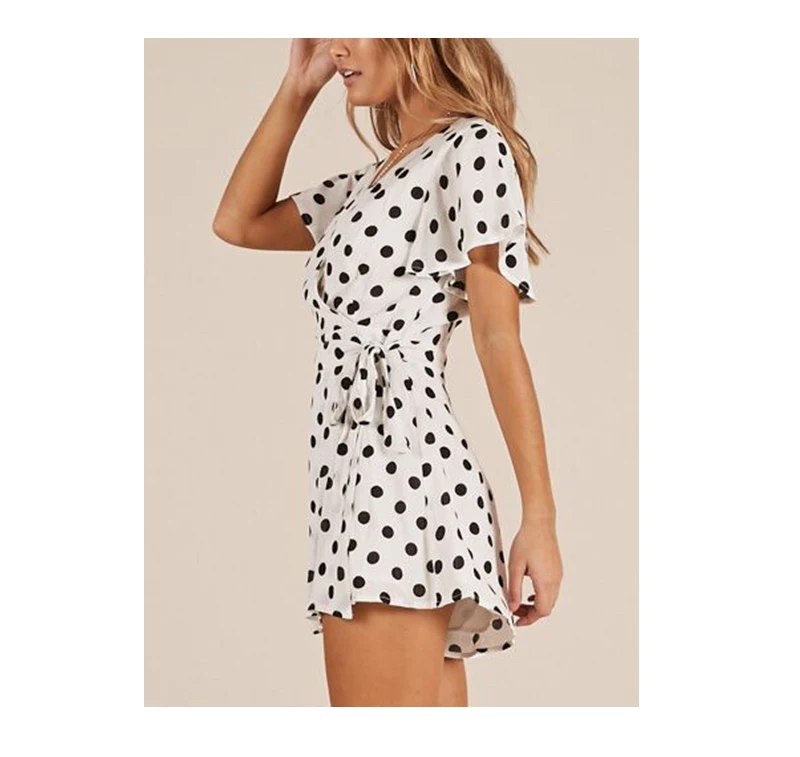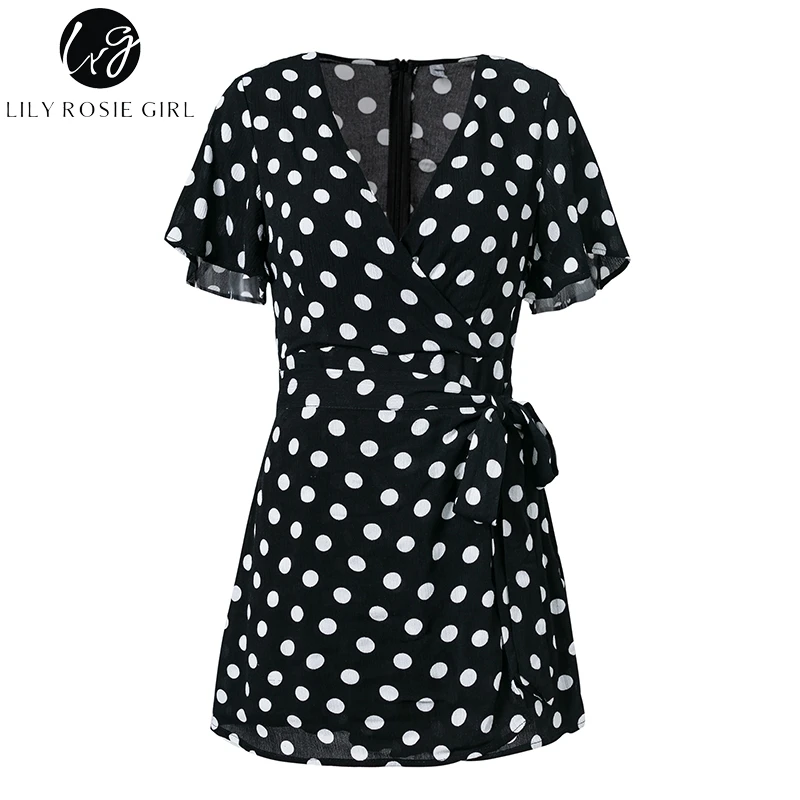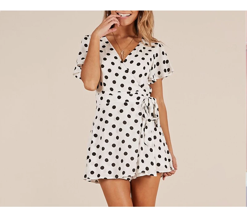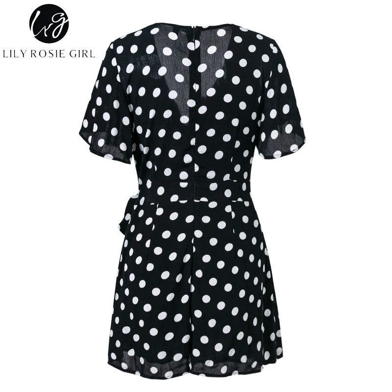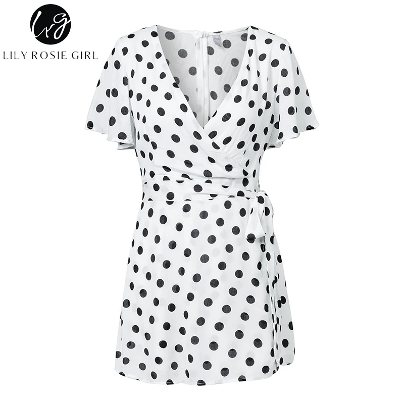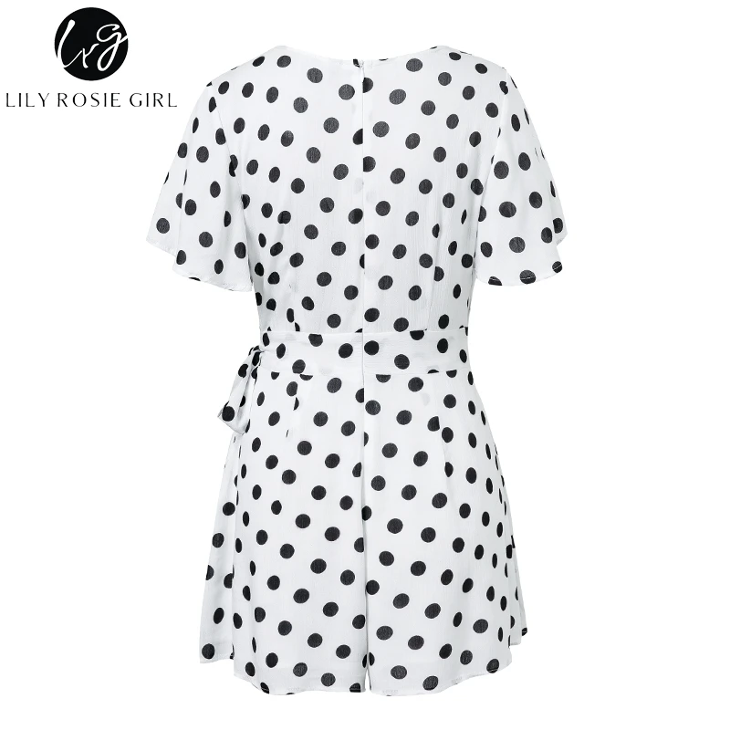 Lily Rosie Girl Dot White Boho Summer Playsuit V Neck Beach Women Playsuit Bow Sexy Jumpsuit Rompers Vestidos