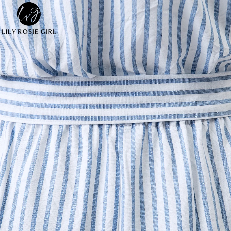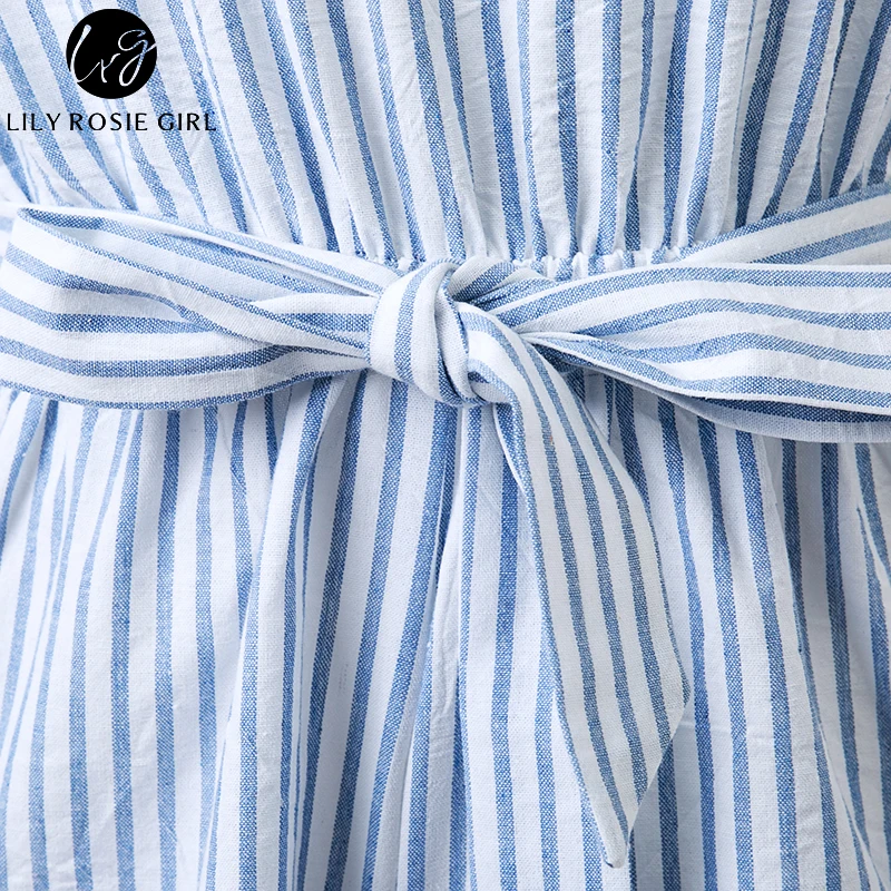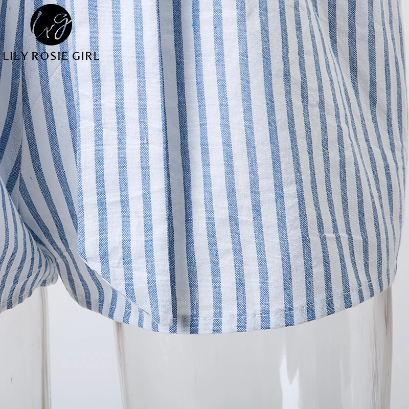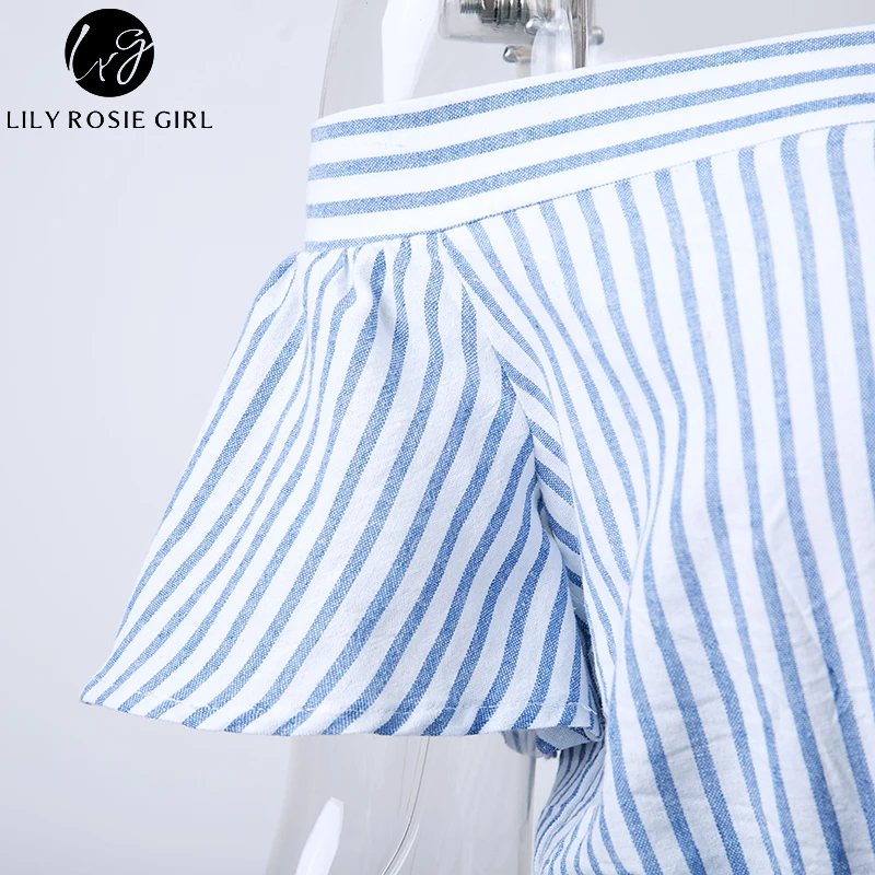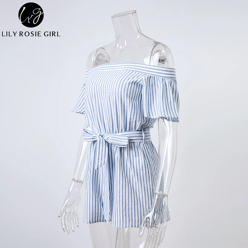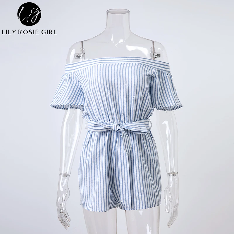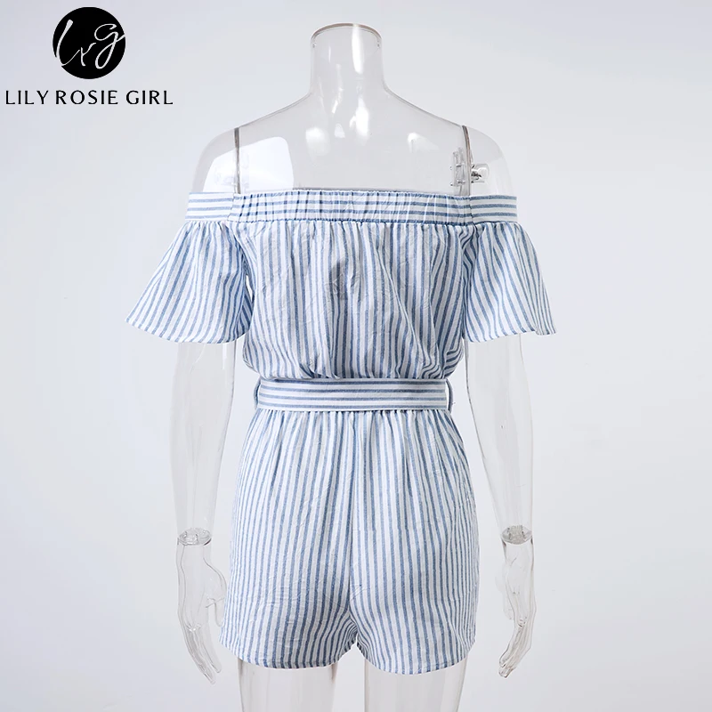 Lily Rosie Girl Off Shoulder Women Summer Sky Blue Sashes Plaid Rompers Casual Short Sleeve Combinaison Femme Playsuits Overalls