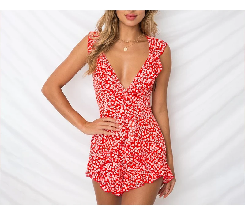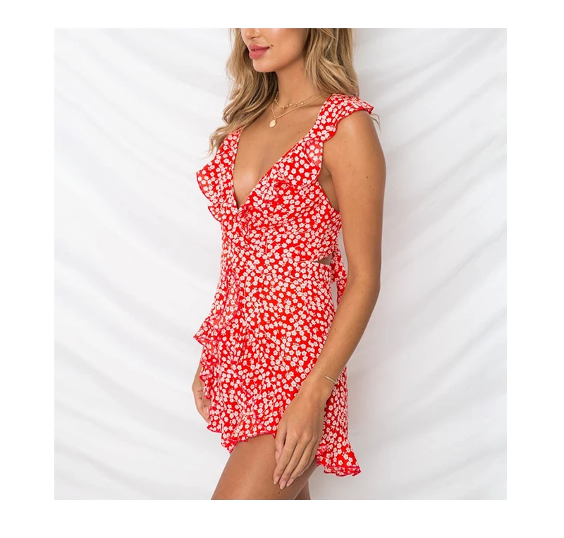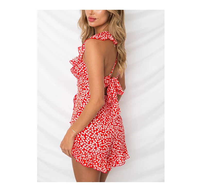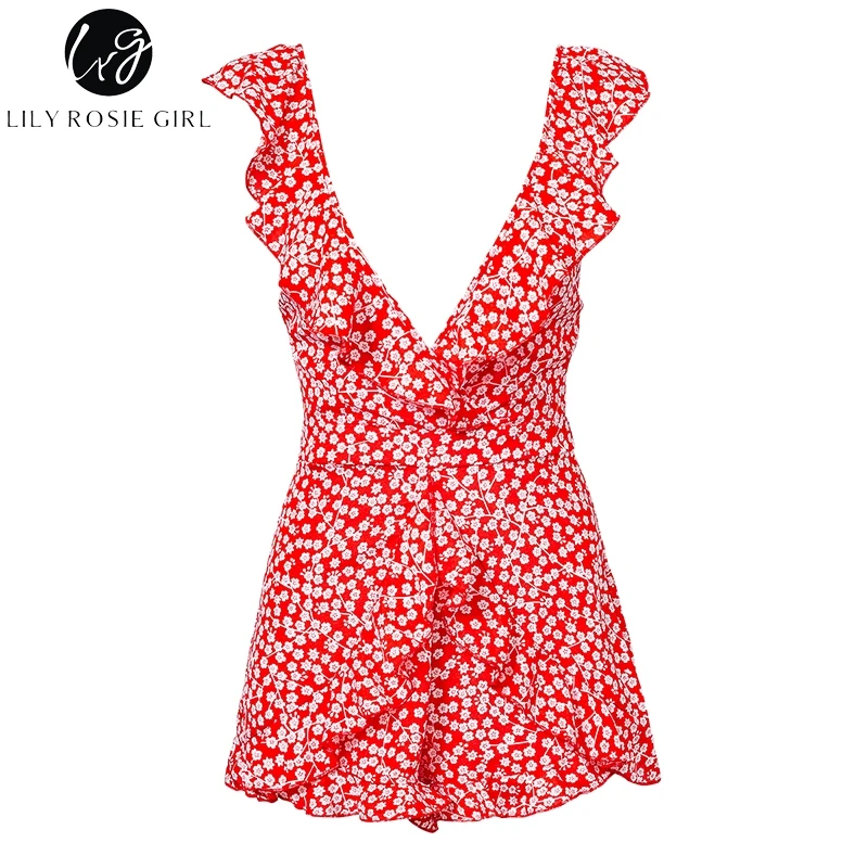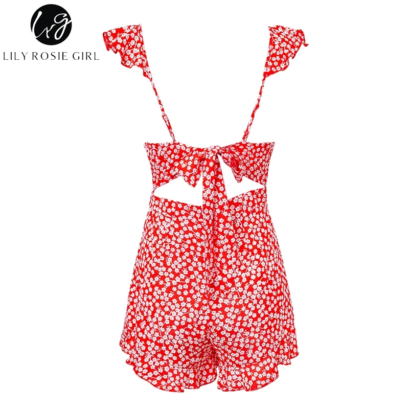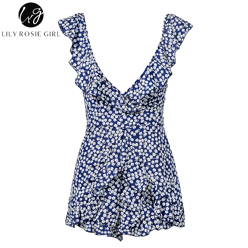 Lily Rosie Girl Print Boho Floral Summer Playsuit V Neck Ruffles Sexy Female Playsuit Backless Shorts Jumpsuit Rompers Vestidos