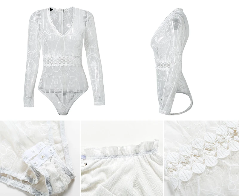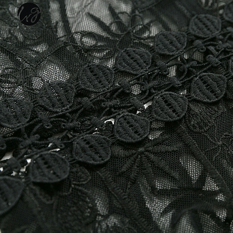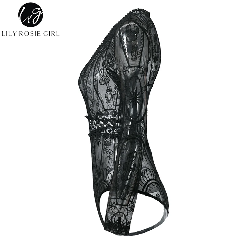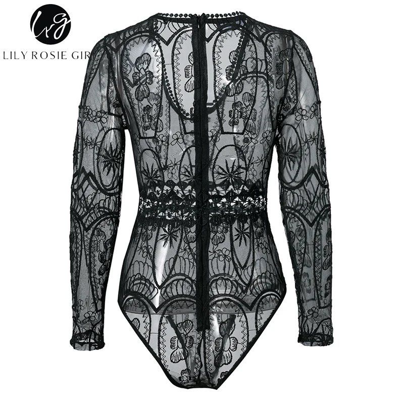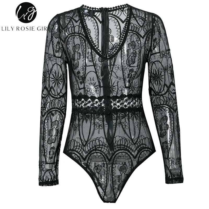 Lily Rosie Girl Sexy Hollow Out Lace Bodysuits Floral Knit Deep V Slim Intimates Long Sleeve Bodycon 2017 Women Short Playsuits