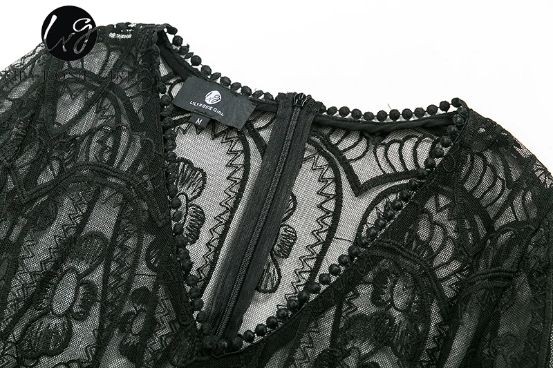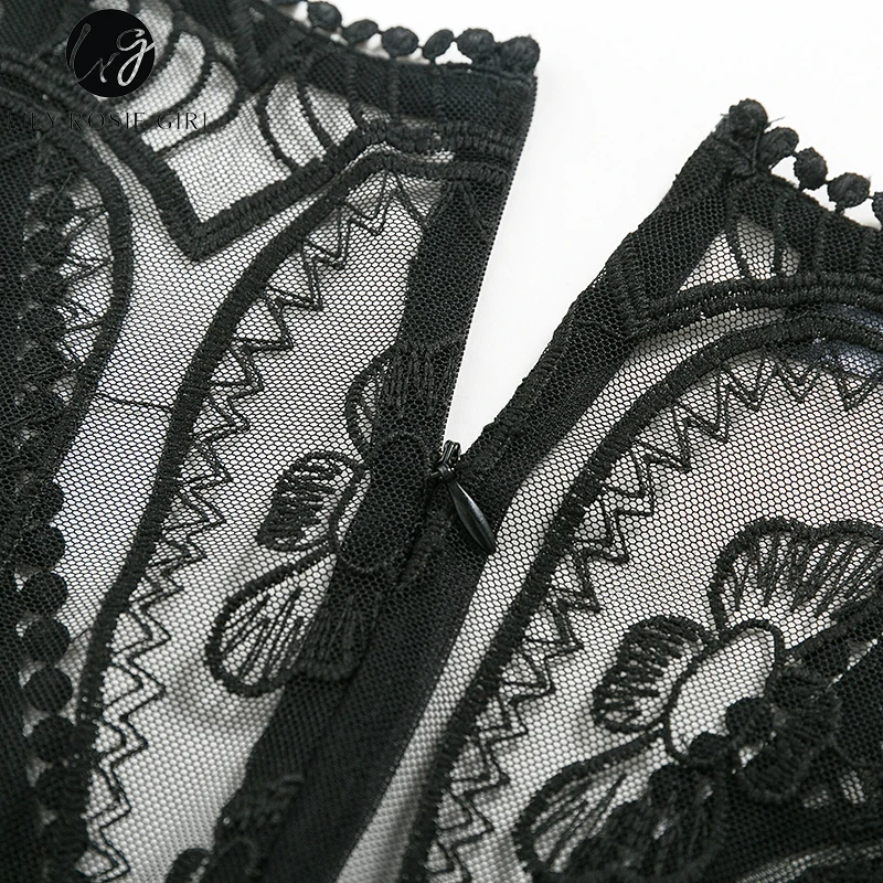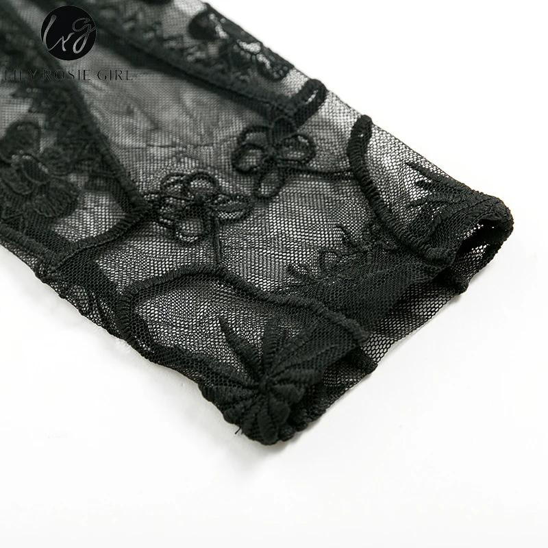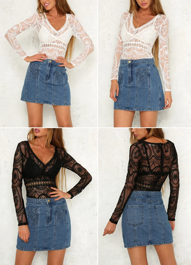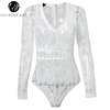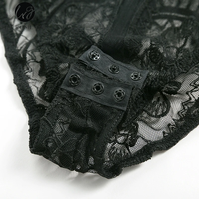 Lily Rosie Girl Sexy Hollow Out Lace Bodysuits Floral Knit Deep V Slim Intimates Long Sleeve Bodycon 2017 Women Short Playsuits