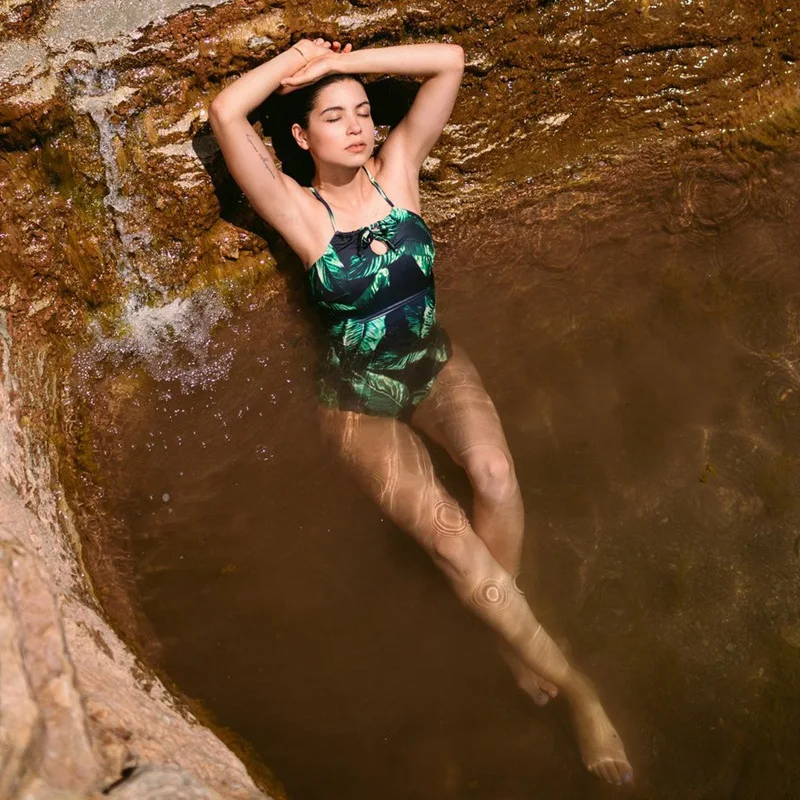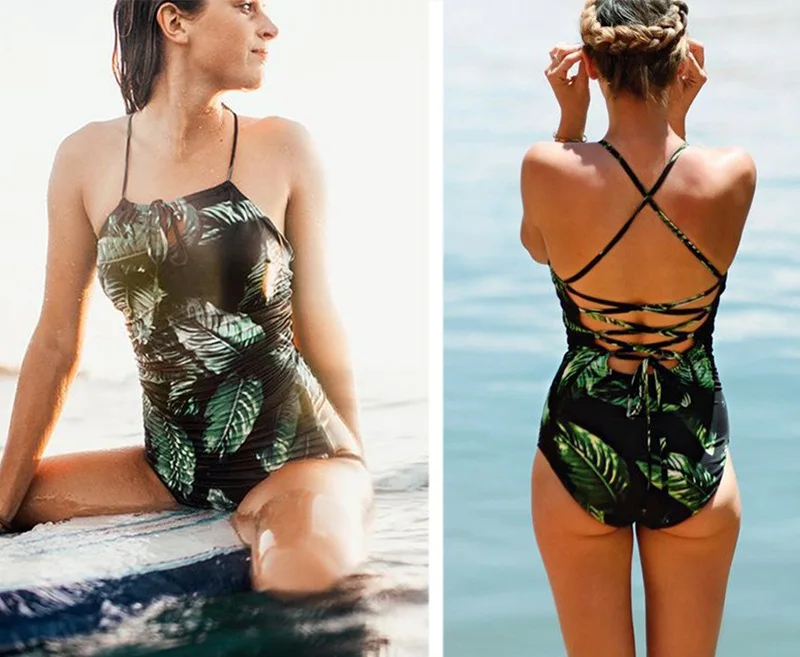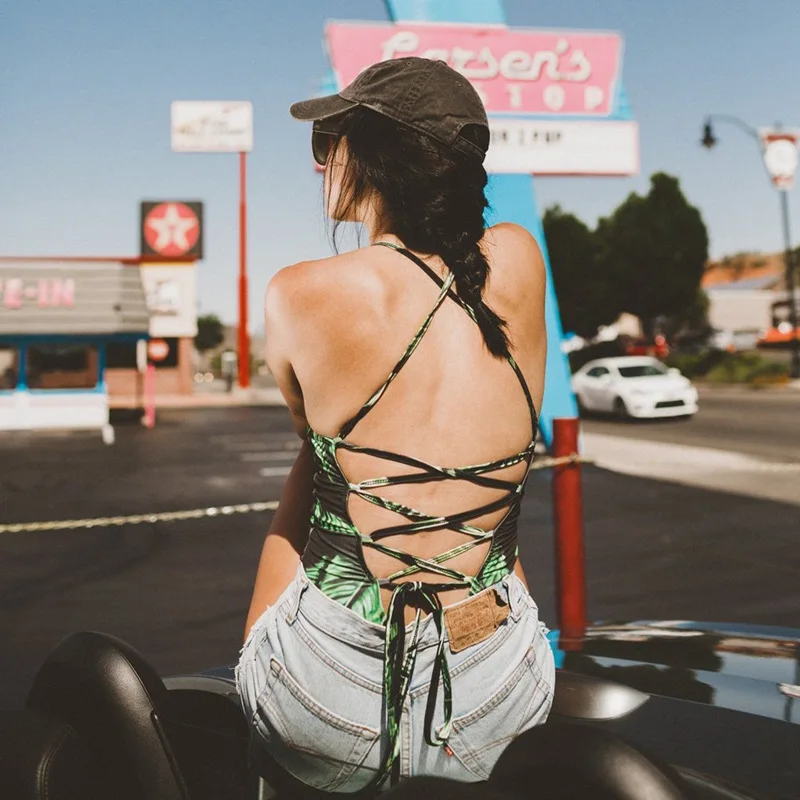 LIVA Strappy Backless Bodysuit Women Leaf Print Sleeveless Summer Beach Hot Bodysuits 2018 Scoop Neck Cross Slim Cami Bodysuit