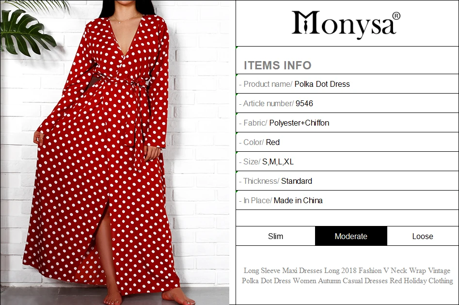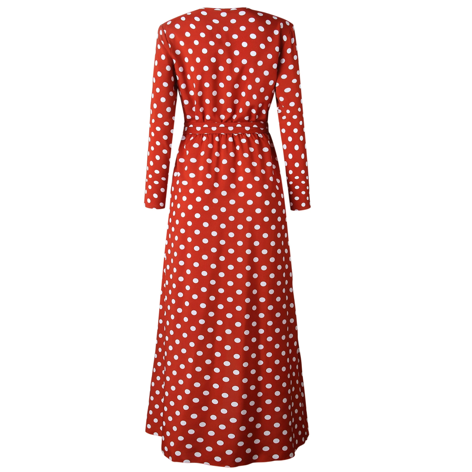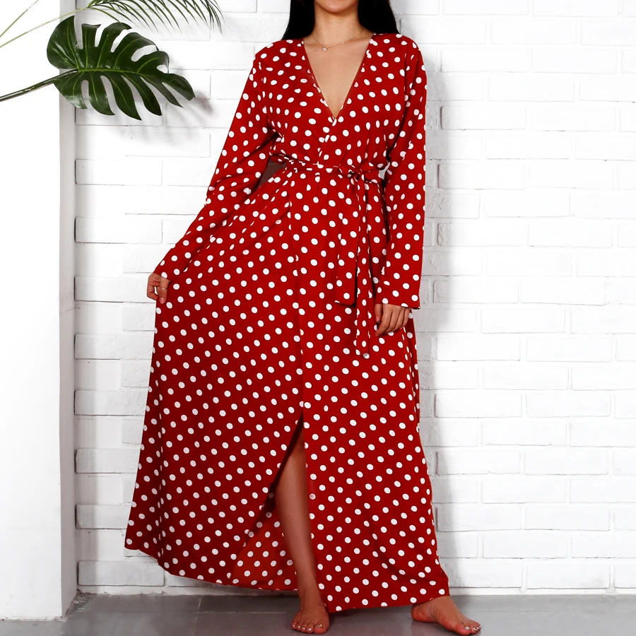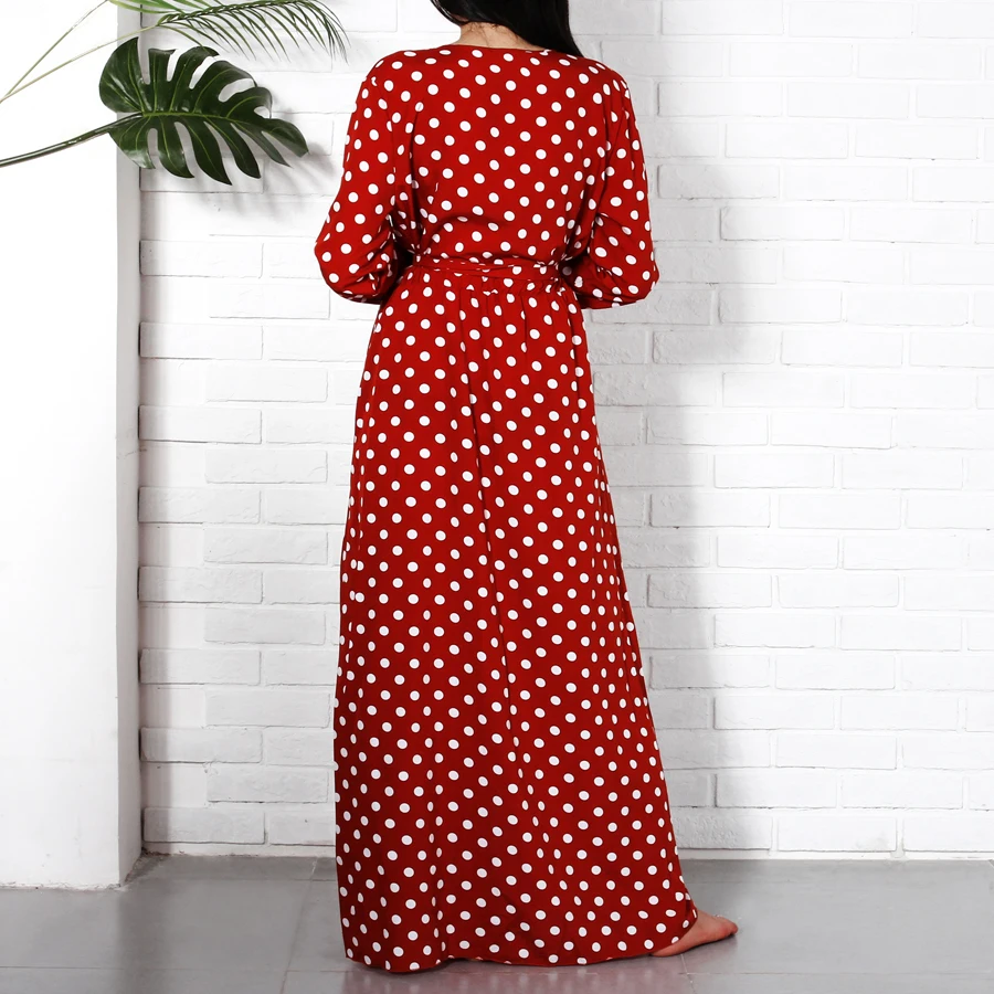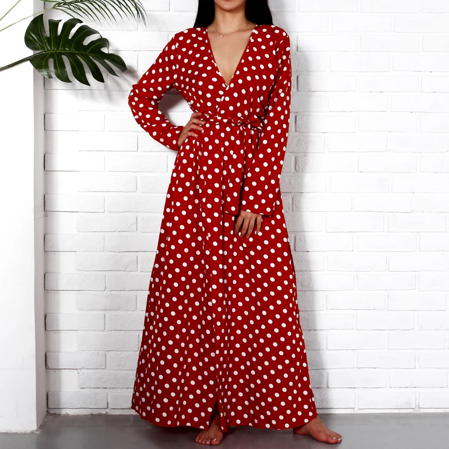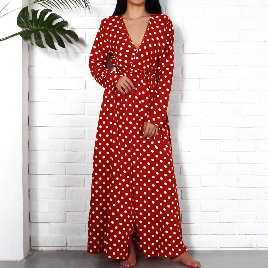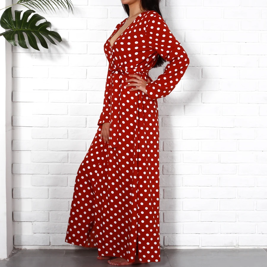 Long Sleeve Maxi Dresses Long 2018 Fashion V Neck Wrap Vintage Polka Dot Dress Women Autumn Casual Dresses Red Holiday Clothing