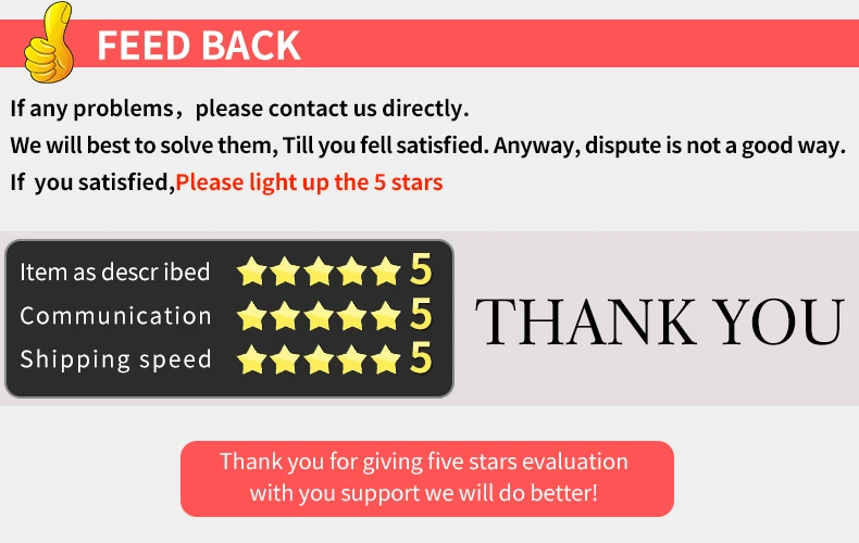 5.Feedback :We will try our best to provide you with good service.If you have any question, please kindly contact us,we will reply you within 24 hours.If you satisfied,please light up the 5 stars.