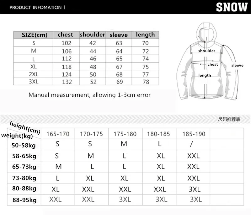 S 160-165CM 43-53KG M 165-170CM 53-62KG L 170-175CM 62-70KG XL175-180CM 70-76KG XXL180-183CM 76-85KG 3XL183-187CM 85-95KG
