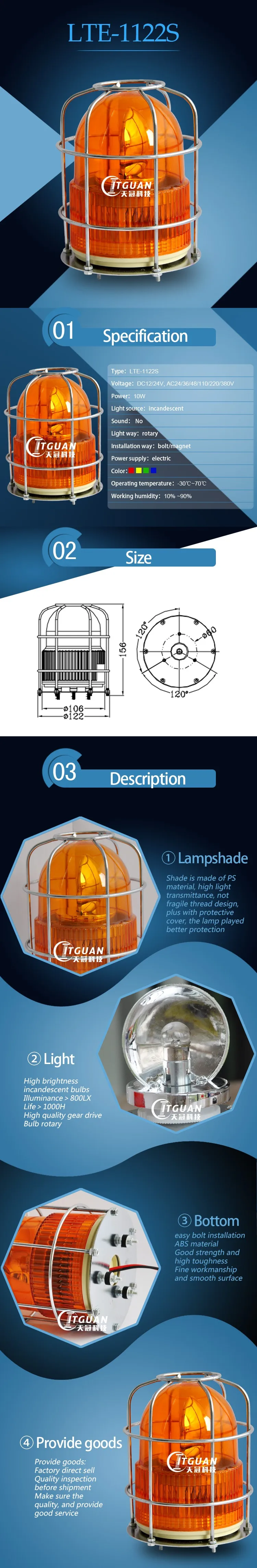LTE-1122S Safety Incandesent Warning Light Anti-collision With Cover DC12V/24V/AC220V Bolt Bottom Amber Red Color Optional Lamp