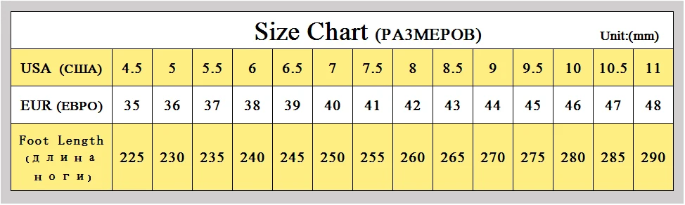 The shoes’ size maybe not fit the standard of your country, please measure your foot length,and choose the right shoes’ size! “EUR” Size is only for reference, only trust the foot length!