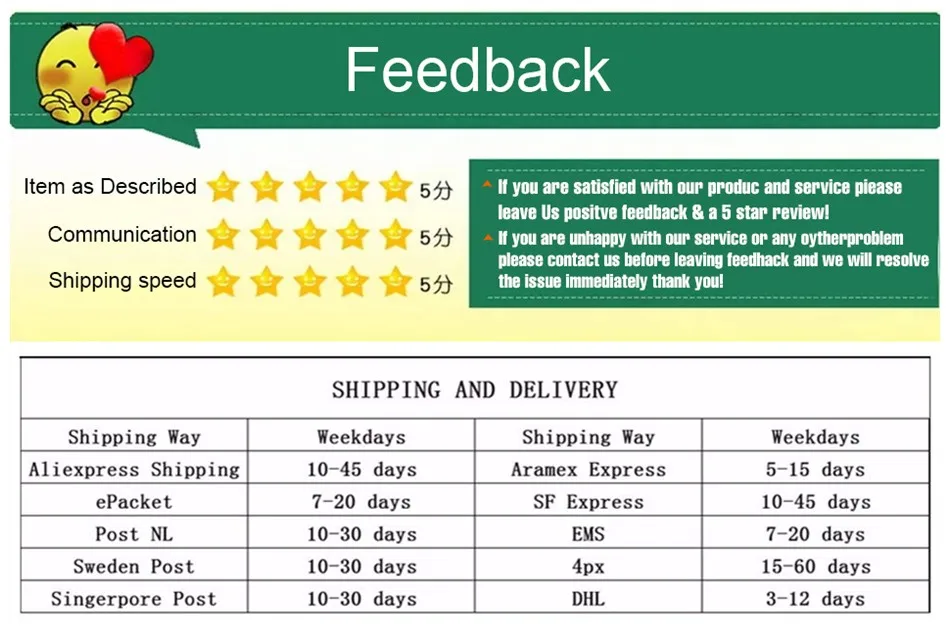 • If you did not receive the product within the guaranteed time( 45 days not including 2-5 day processing) you can request a refund or a reshipment.