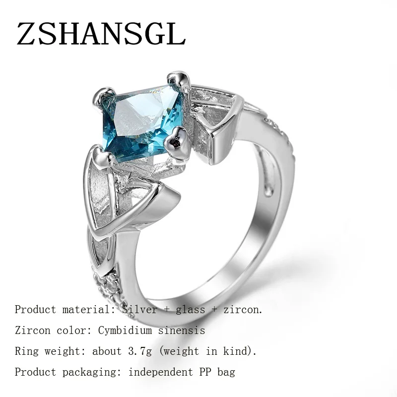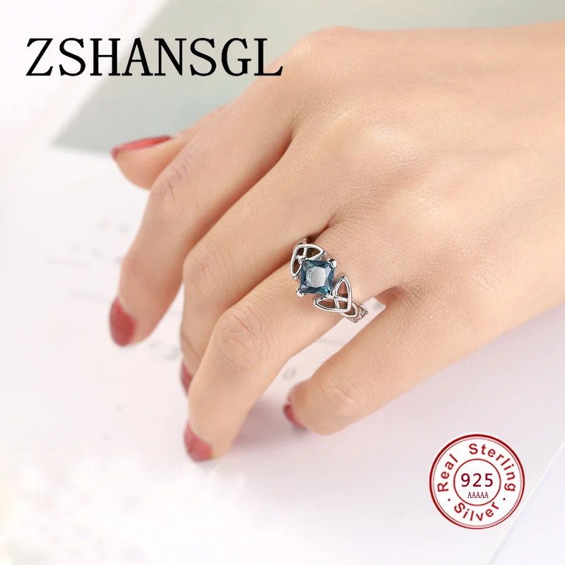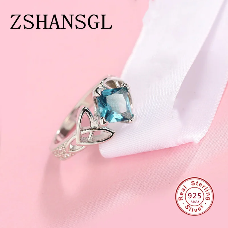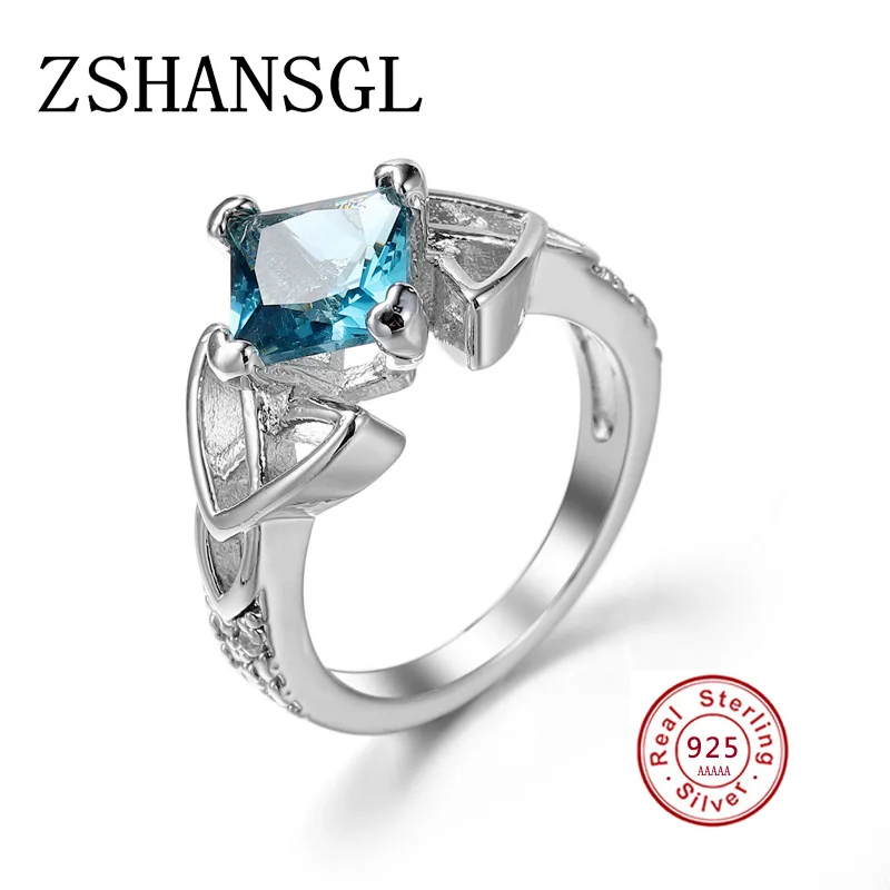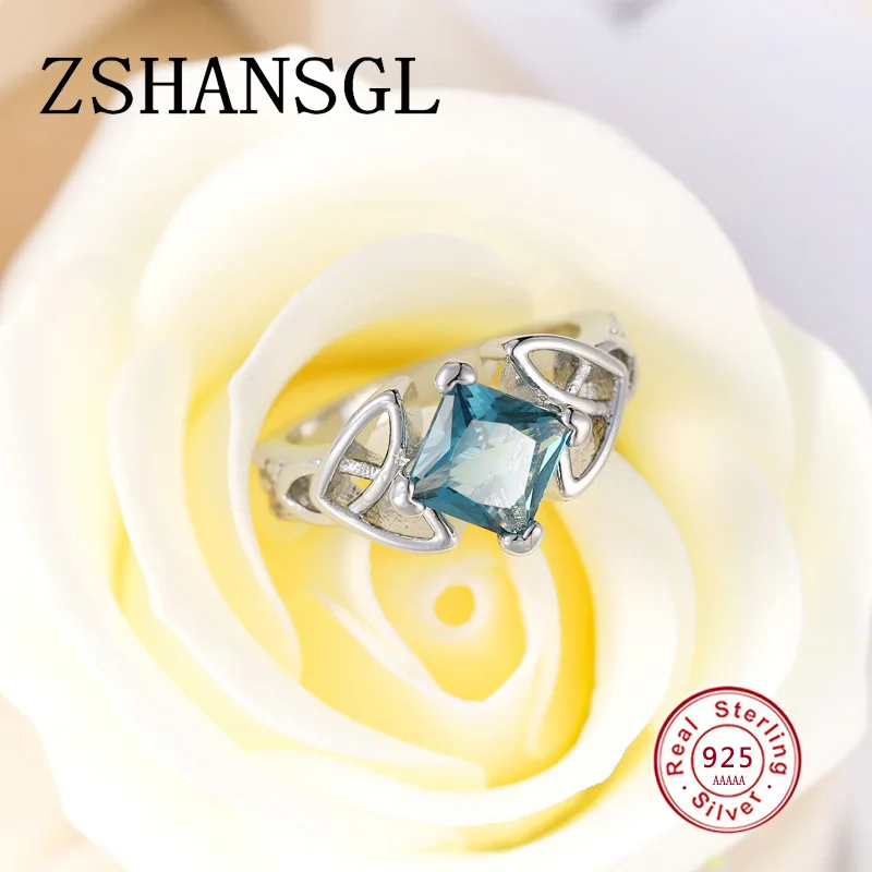 Luxury Princess Cut Hollow-out Blue CZ Ring with Micro Paved Clear Zircon 3 Layers High Polished Women Fashion Wedding Rings