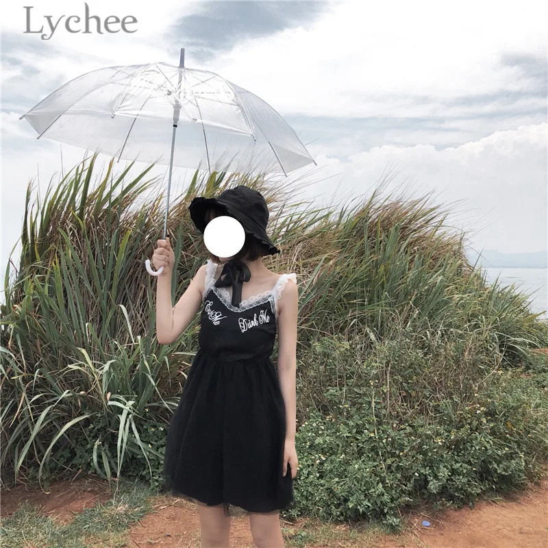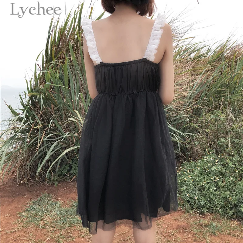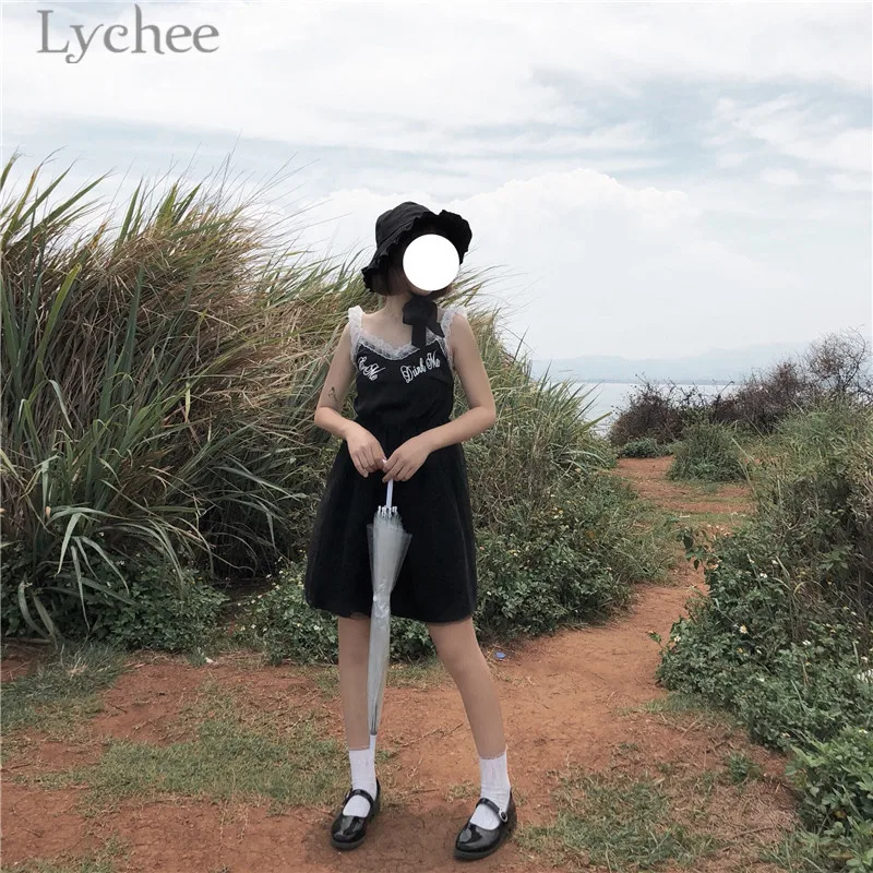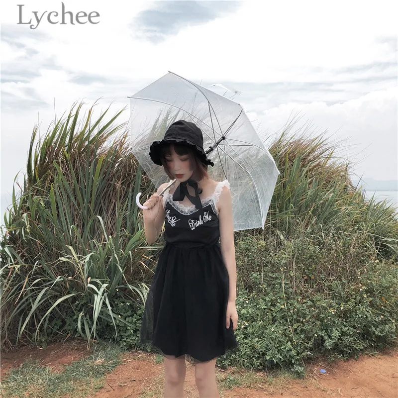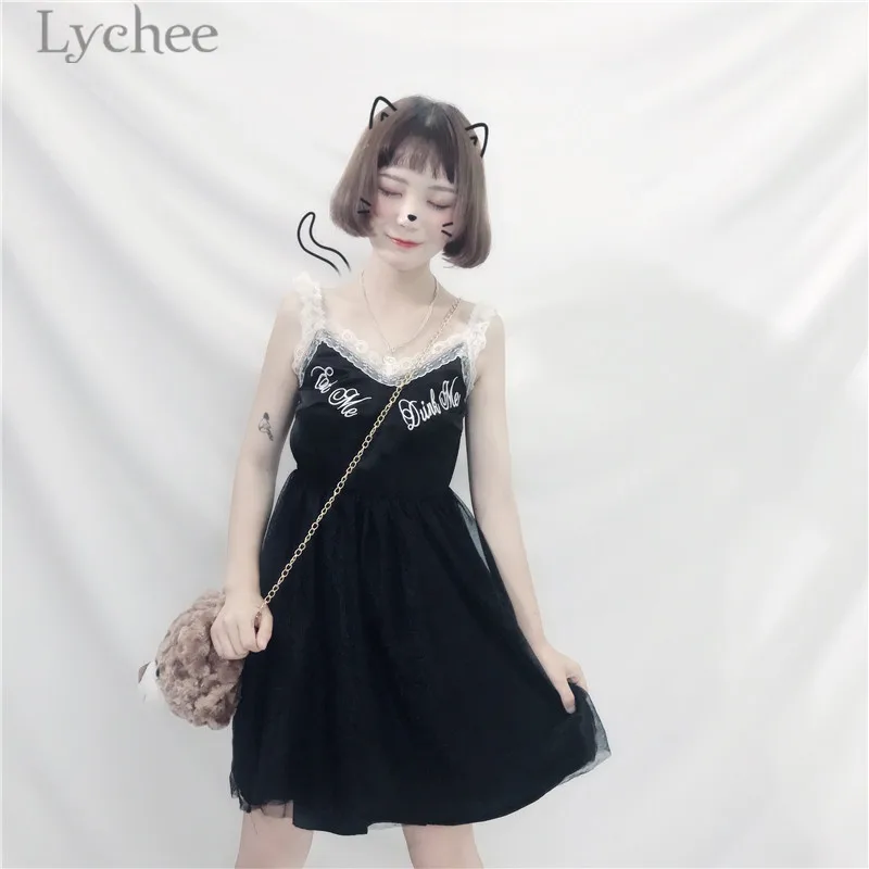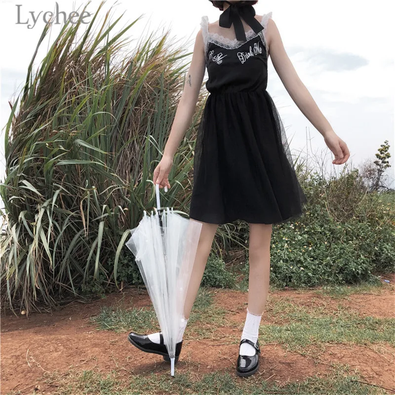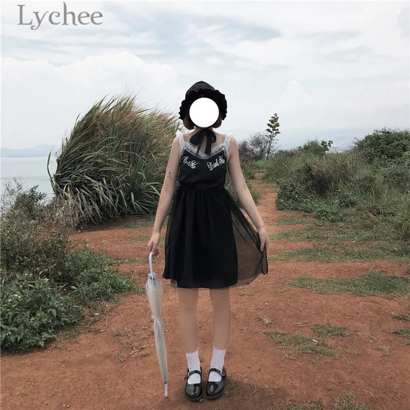 Lychee Harajuku Lace Mesh Patchwork Women Dress Sleeveless V-neck Summer Straps Dresses Gothic Punk Dress Female