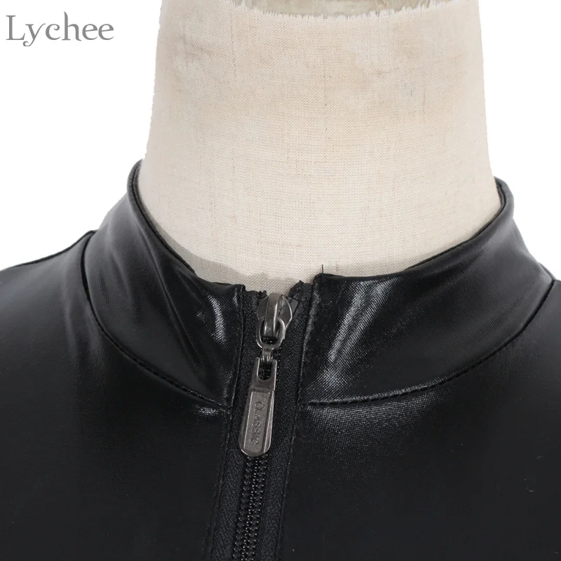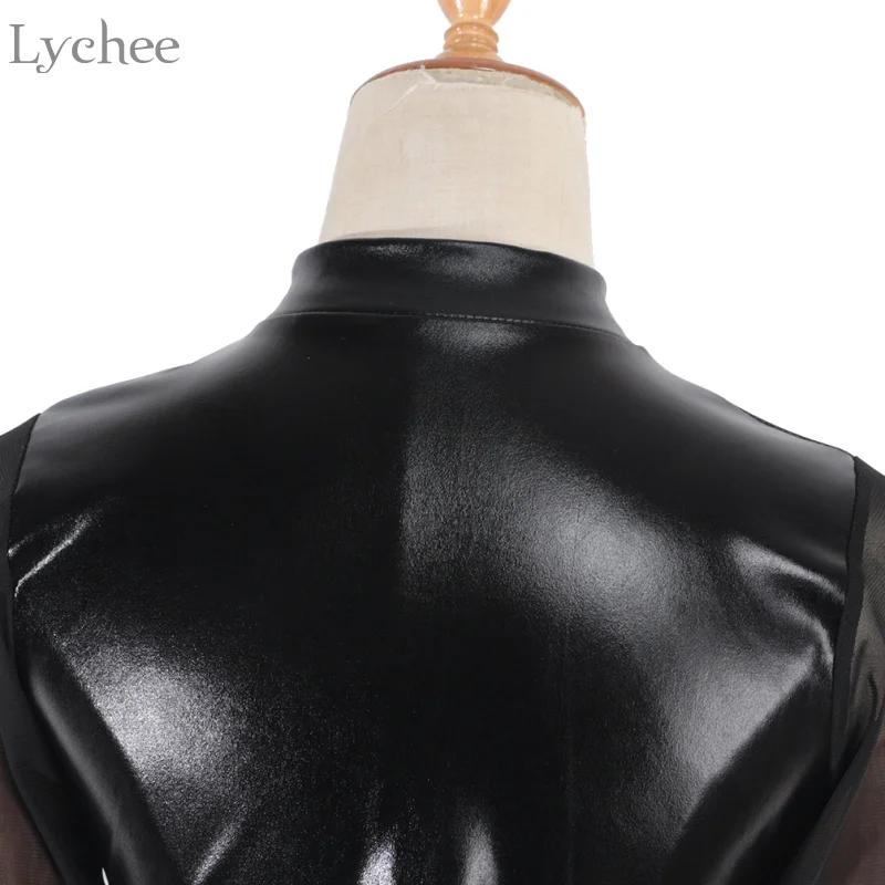 Lychee Sexy Summer Women Bodysuit Mesh Faxu Patchwork Zipper Slim Skinny Long Sleeve Playsuit Romper
