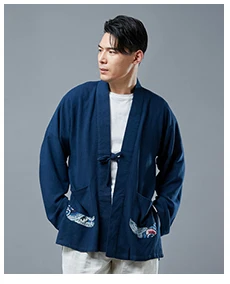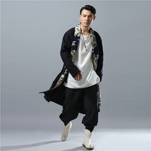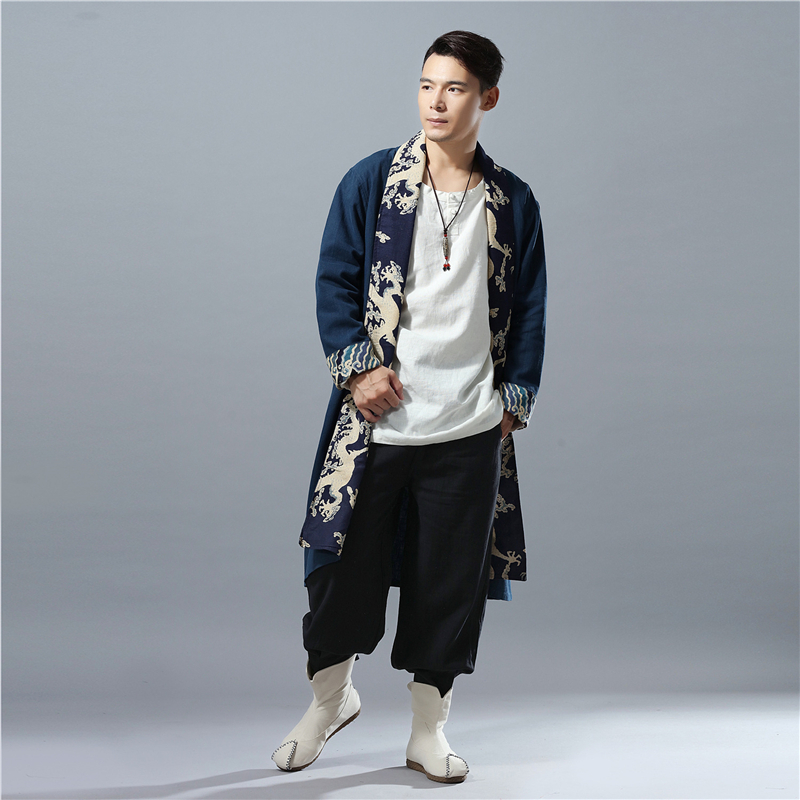 LZJN 2018 Autumn Long Coat Men Capes Chinese Dragon Patchwork Linen Kimono Cardigan Loose Windbreaker Male Overcoat Trenchcoat