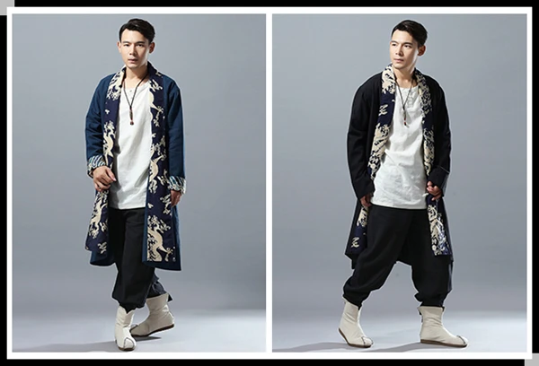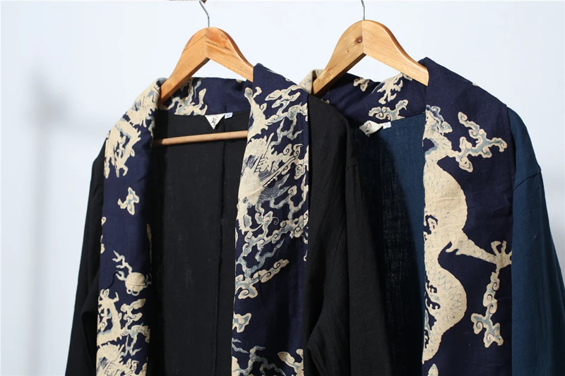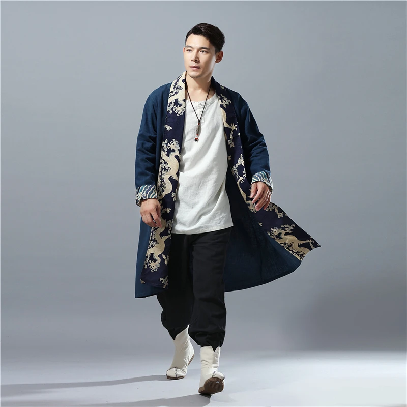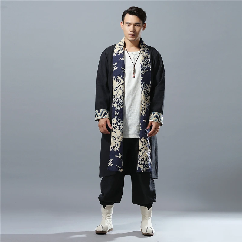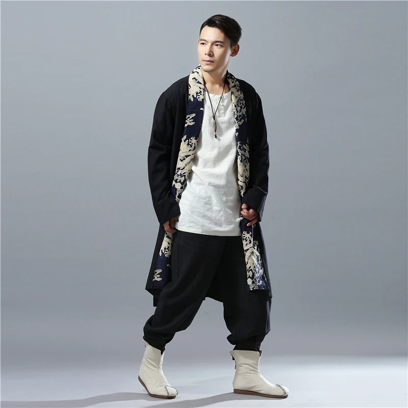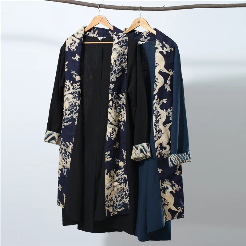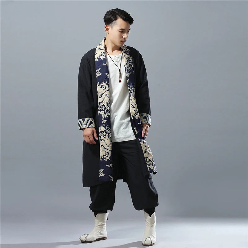 LZJN 2018 Autumn Long Coat Men Capes Chinese Dragon Patchwork Linen Kimono Cardigan Loose Windbreaker Male Overcoat Trenchcoat