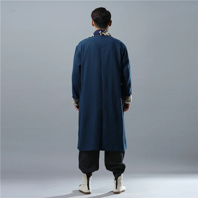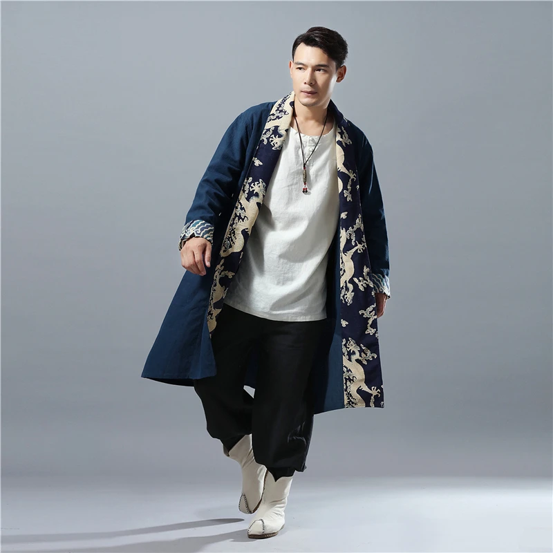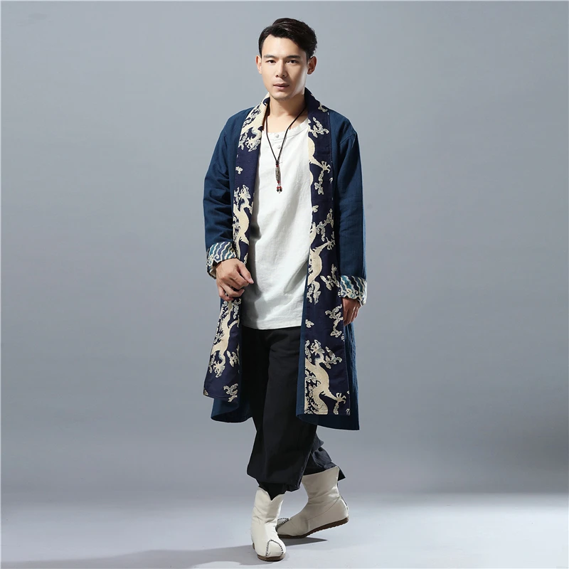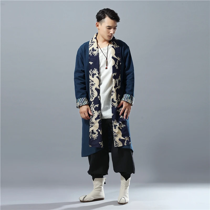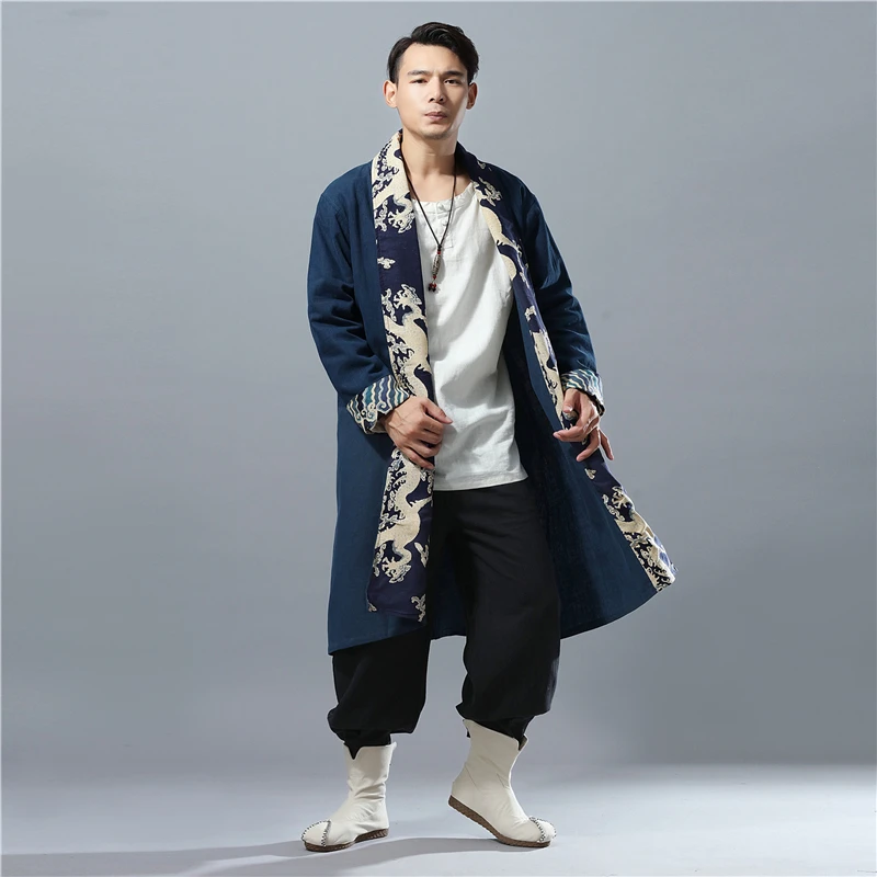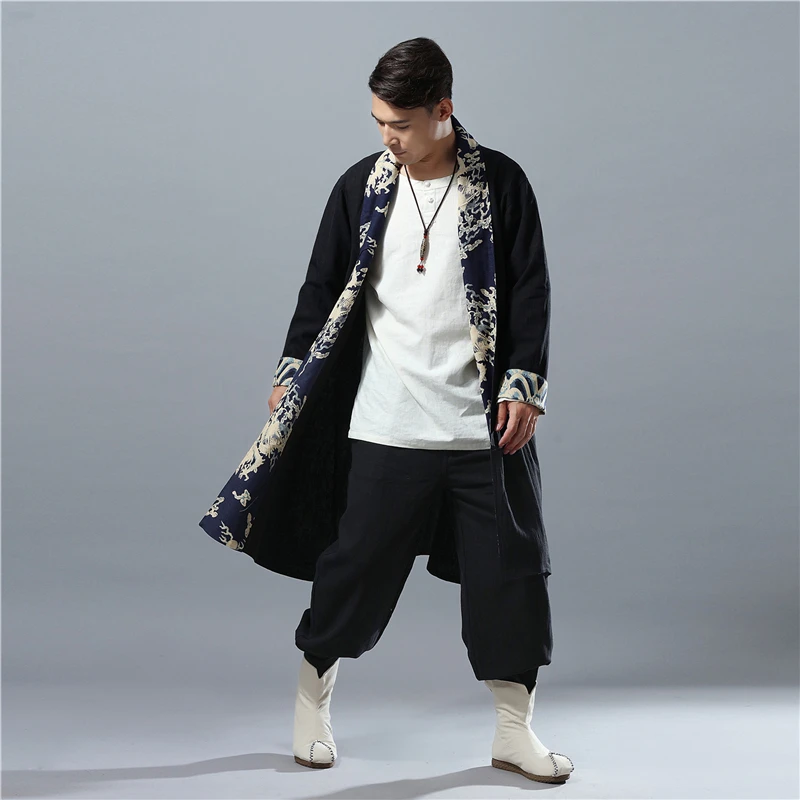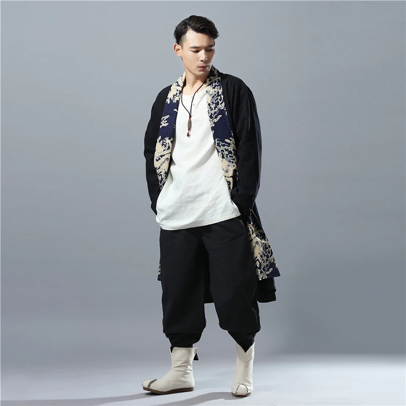 LZJN 2018 Autumn Long Coat Men Capes Chinese Dragon Patchwork Linen Kimono Cardigan Loose Windbreaker Male Overcoat Trenchcoat