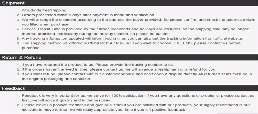 • If you did not receive the product within the guaranteed time( 45 days not including 2-5 day processing) you can request a refund or a reshipment.