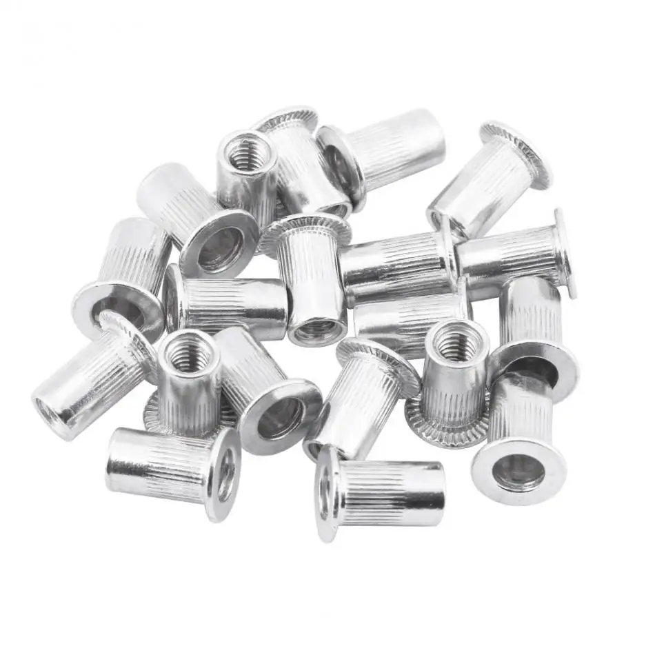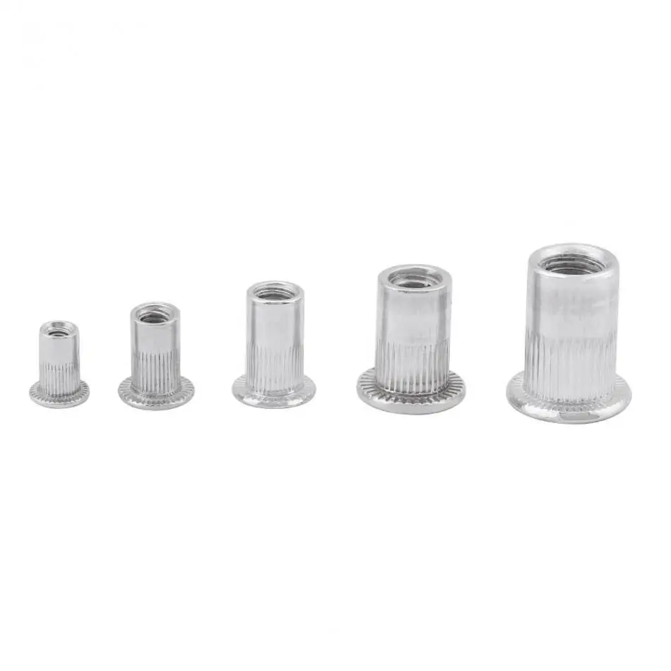 - With open end, small flange, round hole, threaded inner wall and partial anti-skid surface, these flat head rivet nut has a good performance of fastener function.