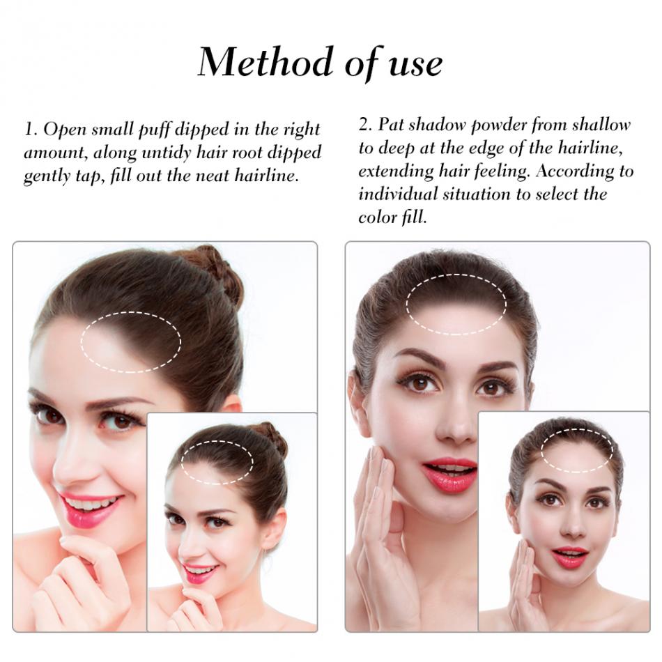 The hair line powder is made of healthy ingredients, it won’t damage hair. The color is natural and coloring easily. It can beautify the hairline curve, to create a beautiful hairstyle, gently painted, modified uneven edge of the hair. Long lasting effect, uneasy to drop or fade.