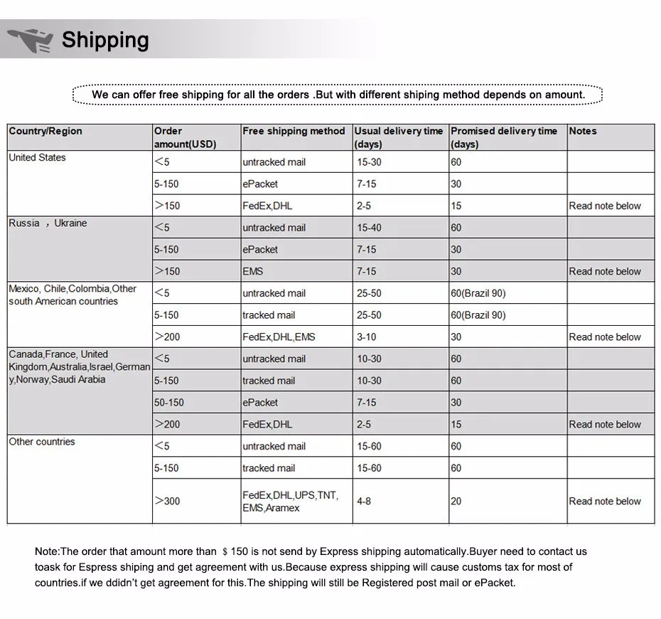 Packages from our warehouse in China will be shipped by ePacket or EMS depending on the weight and size of the product. Packages shipped from our US warehouse are shipped through USPS.