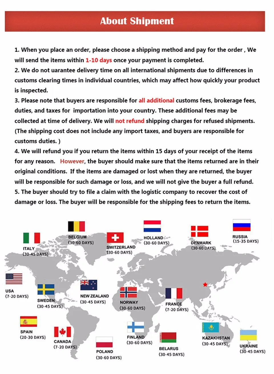 *You can submit refund requests within 15 days after the guaranteed period for delivery (45 days) has expired. You can do it by sending a message on Contact Us page