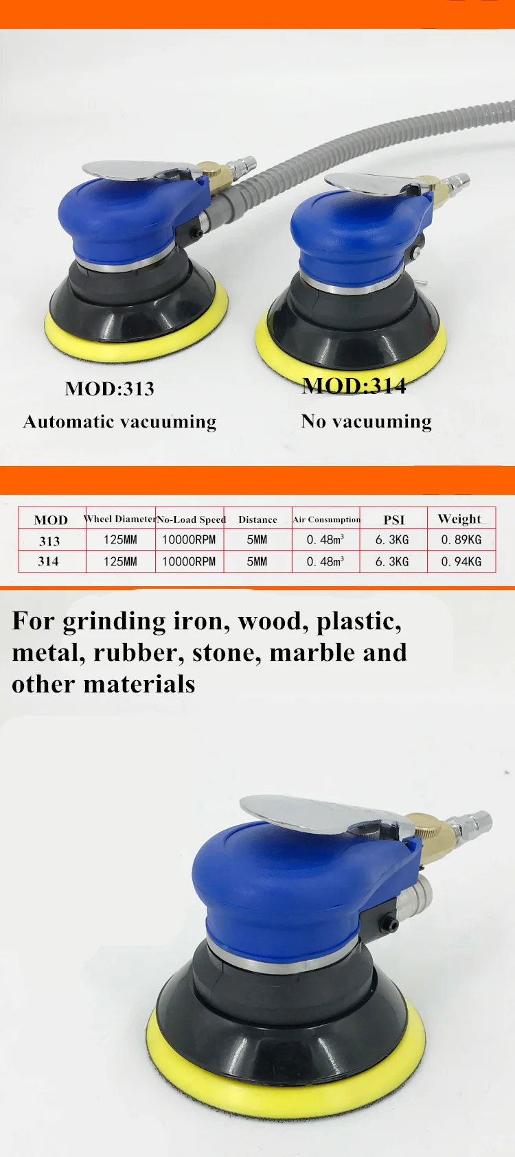 1. For grinding iron, wood, plastic, metal, rubber, stone, marble and other materials, polished, fine polishing, high-performance series designed it to 10000rpm high speed curve over the working surface without swirl, widely applicable grinding treatment in the furniture industry, the mold industry, product parts and other flat surfaces.
