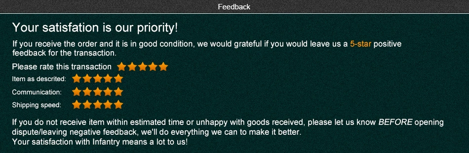 • If you did not receive the product within the guaranteed time( 45 days not including 2-5 day processing) you can request a refund or a reshipment.