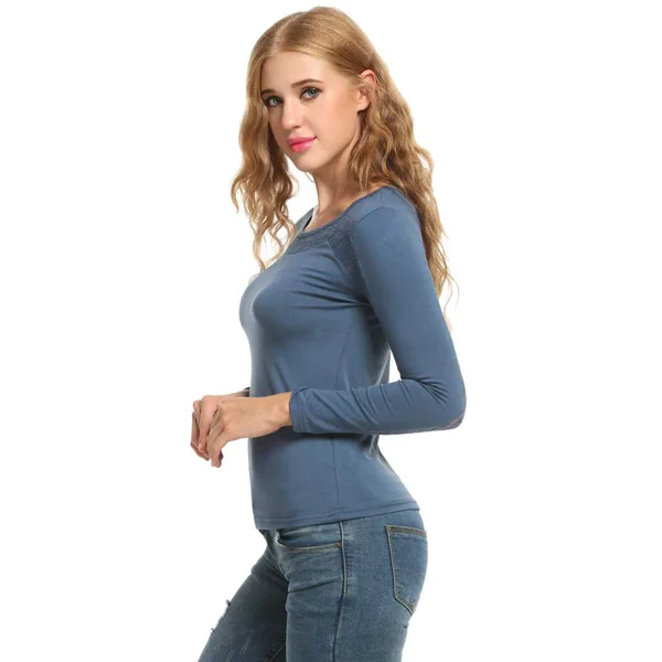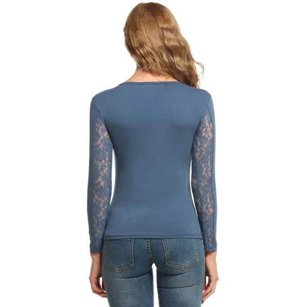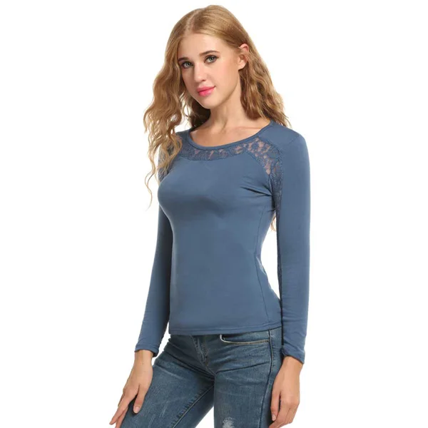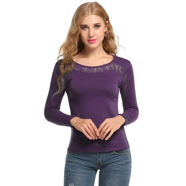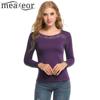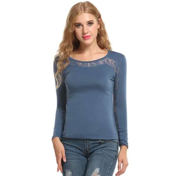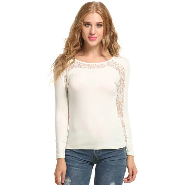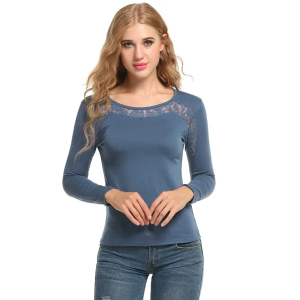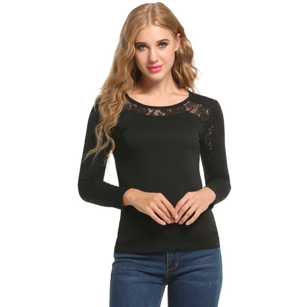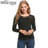 Meaneor New Women tshirt Casual Long Sleeve O-Neck Lace Patchwork Hollow Out Top T-Shirt Autumn Shirts Lace Top Tees