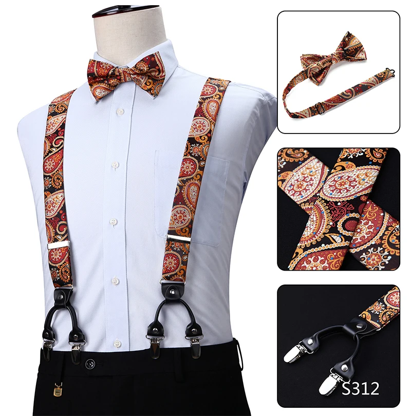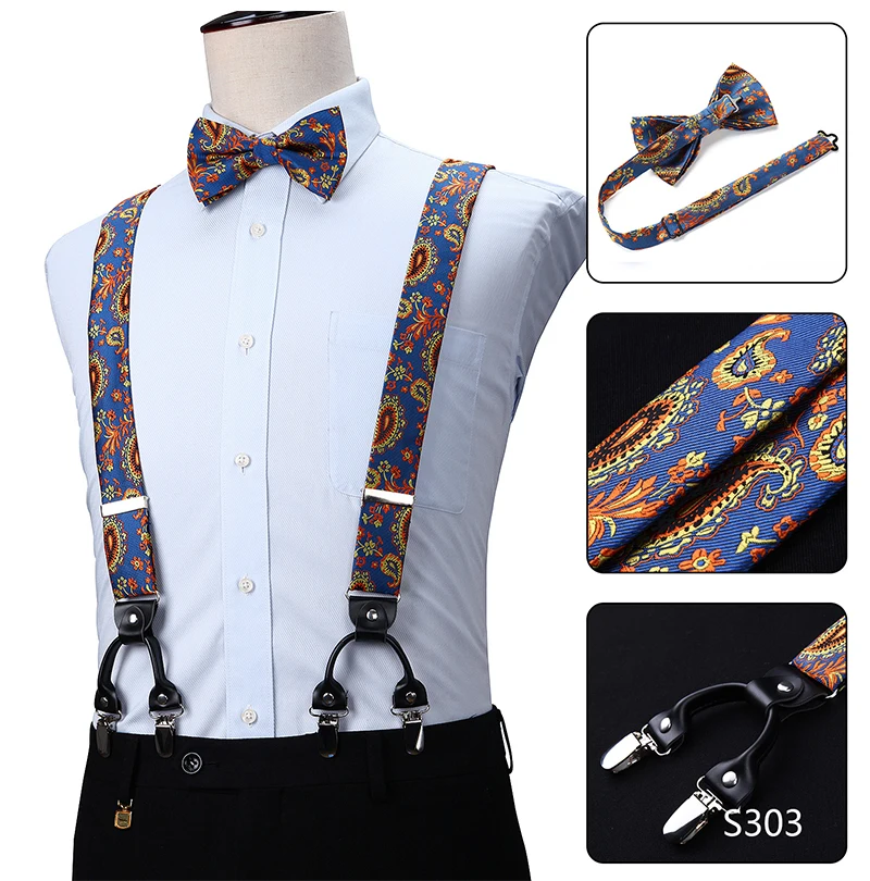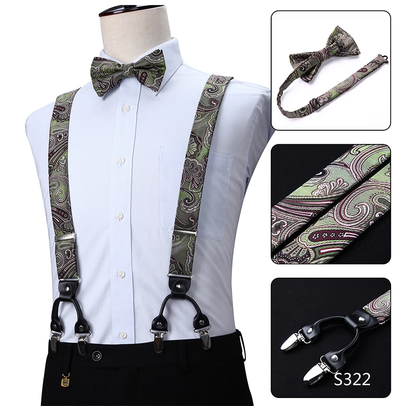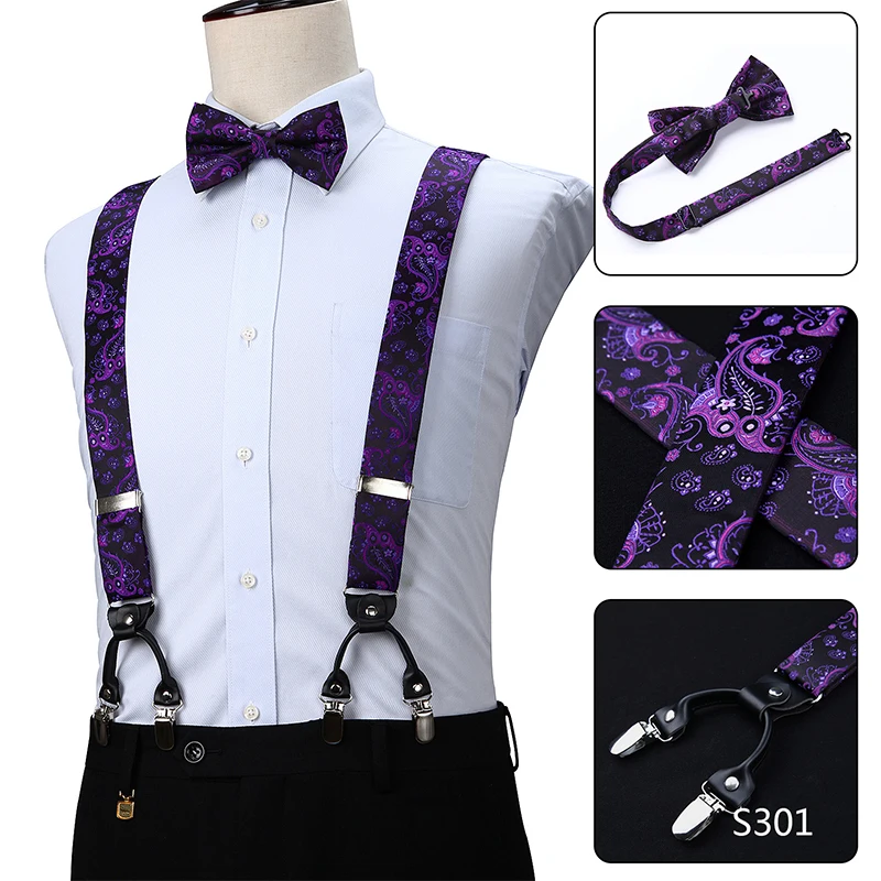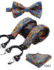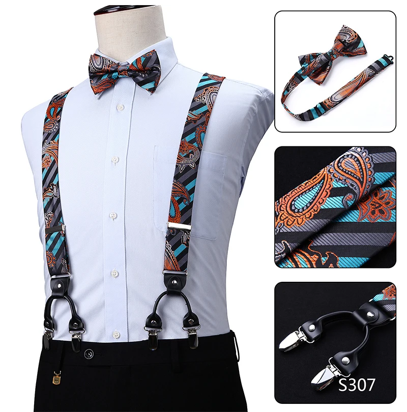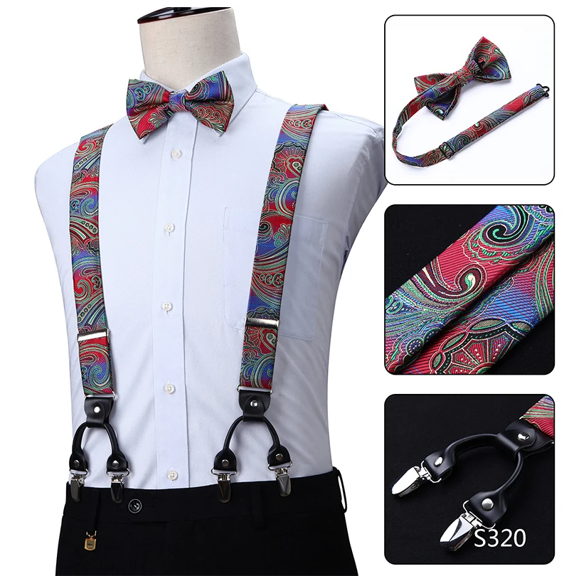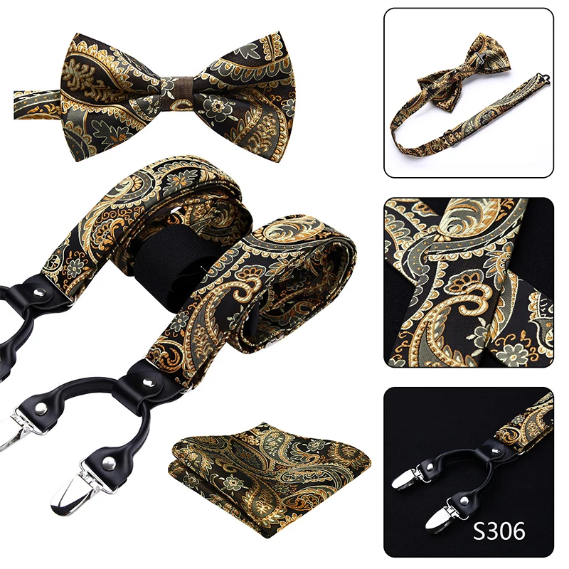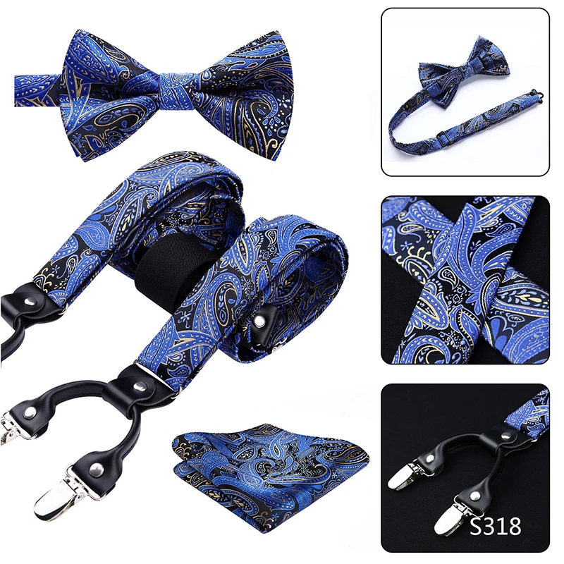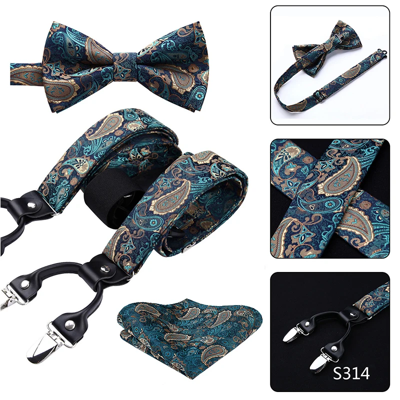 Men Suspenders Paisley Fashion Wedding Various 6 Clips Party Pre-Tied Bowtie Pocket Square Set Adjustable Braces #S04
