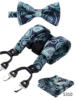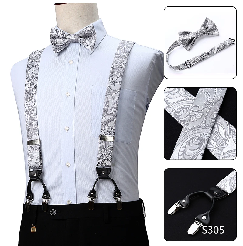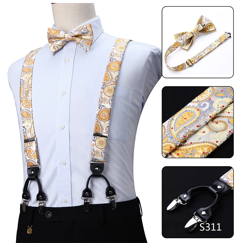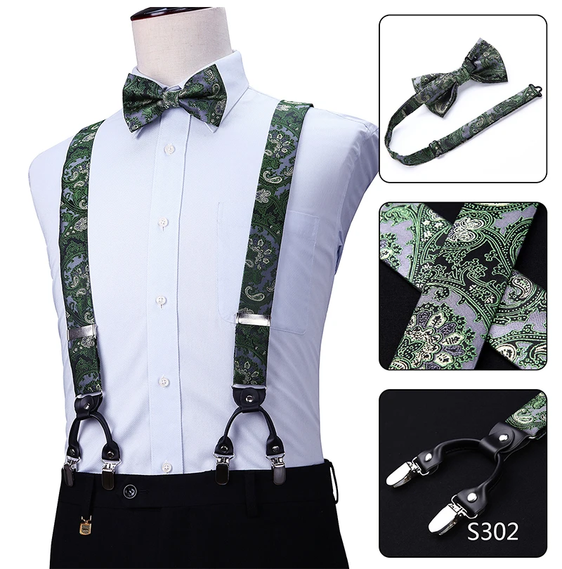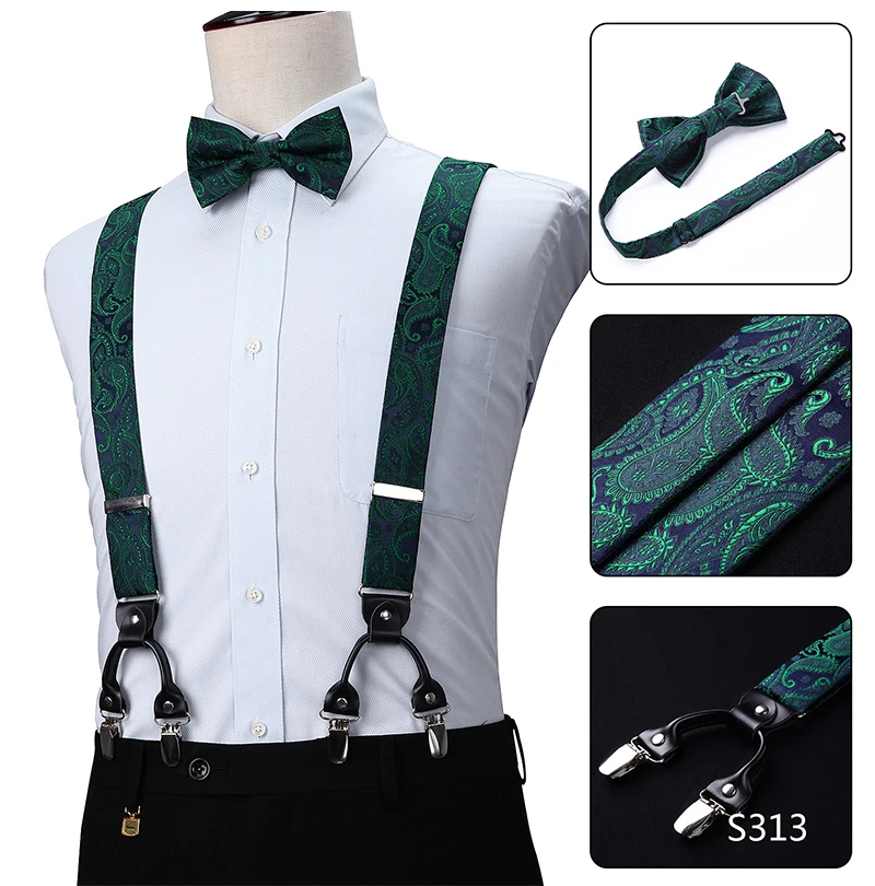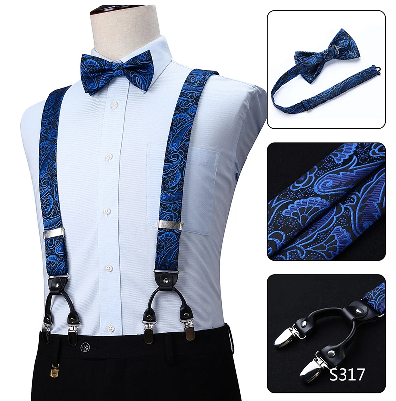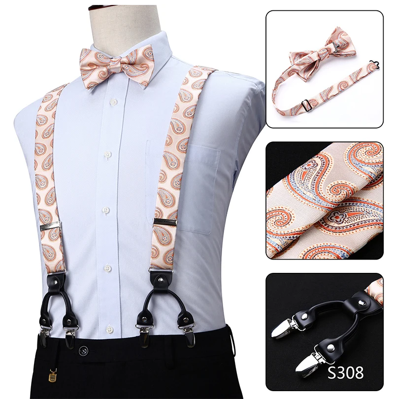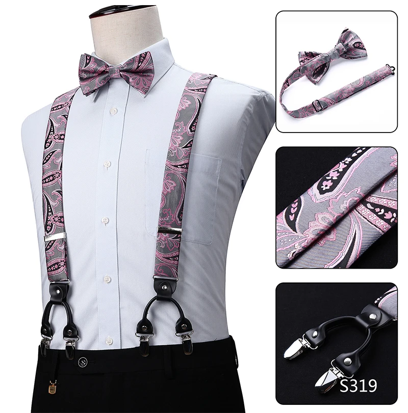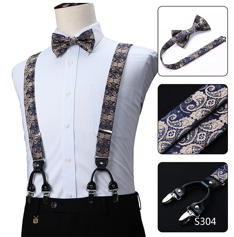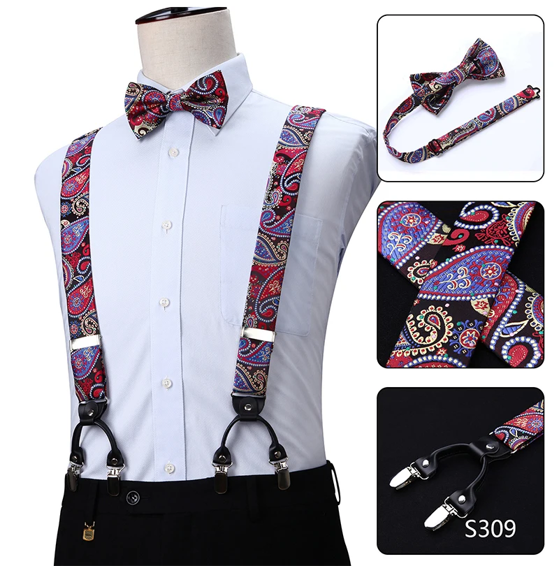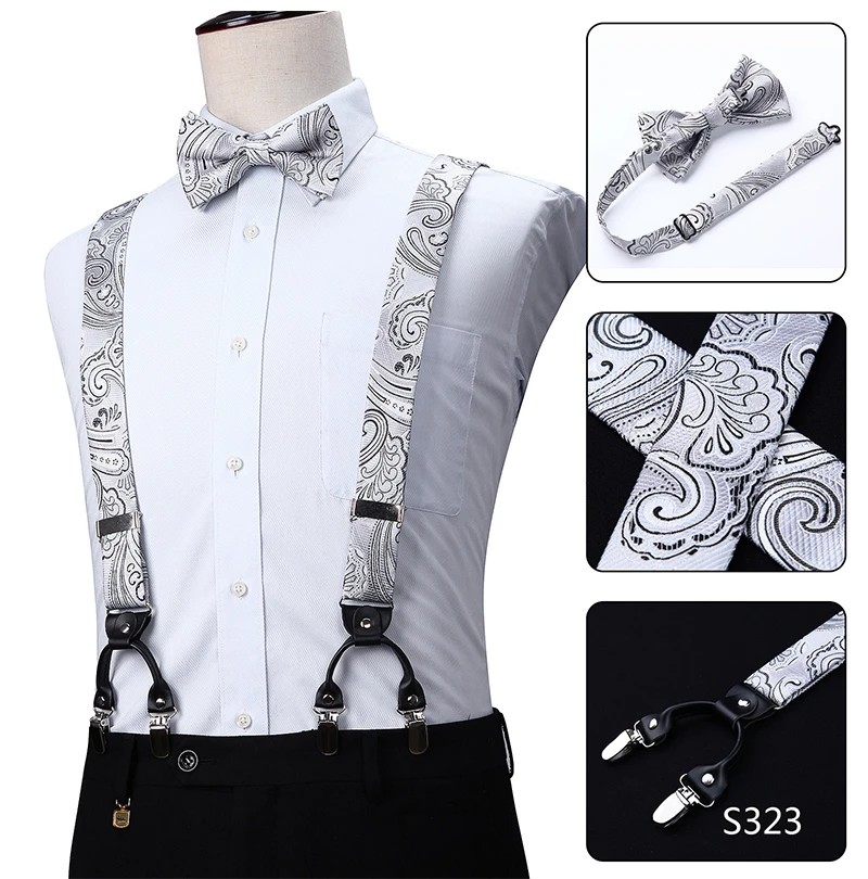 Men Suspenders Paisley Fashion Wedding Various 6 Clips Party Pre-Tied Bowtie Pocket Square Set Adjustable Braces #S04