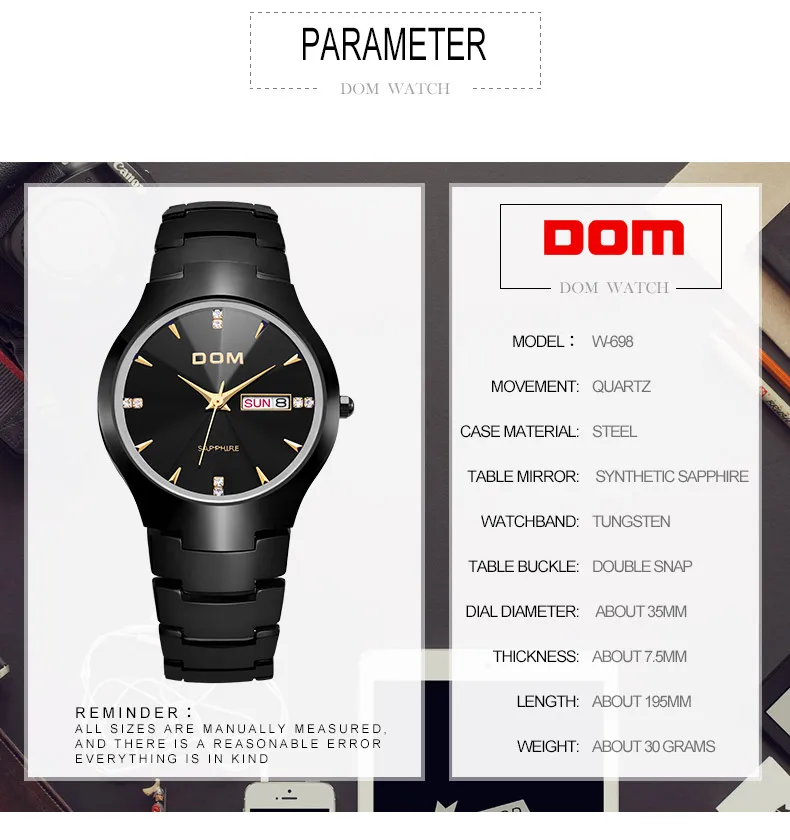 Men watch sport Luxury Top DOM Brand tungsten steel Wrist waterproof Business Quartz watches Fashion Casual W-698-1M2