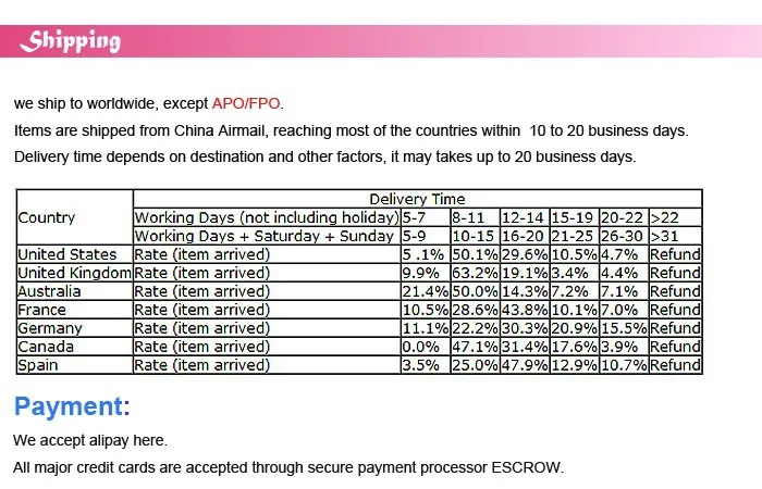 • If you did not receive the product within the guaranteed time( 45 days not including 2-5 day processing) you can request a refund or a reshipment.