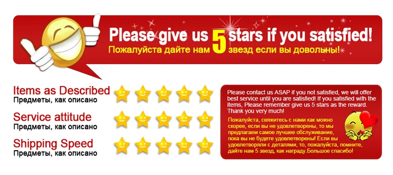 1. If you are satisfied with our items, please give us 5 stars on all of the detail of the seller rating and positive feedback; For our old customers, we will give 3% discount for next order.
