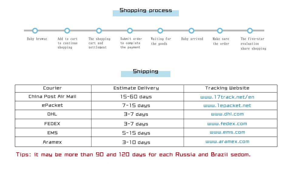 Packages from our warehouse in China will be shipped by ePacket or EMS depending on the weight and size of the product. Packages shipped from our US warehouse are shipped through USPS.