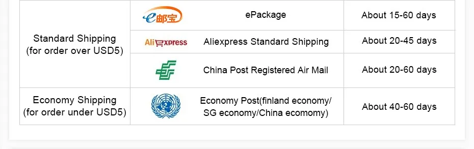 Packages from our warehouse in China will be shipped by ePacket or EMS depending on the weight and size of the product. Packages shipped from our US warehouse are shipped through USPS.
