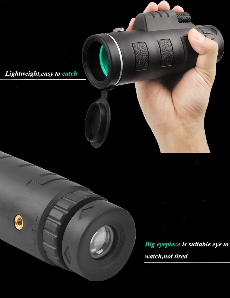 Portable and compact, this 40X60 outdoor monocular is the perfect tool for birds searching, concert watching, golfing, hunting, climbing, fishing, attending sports events or even just view enjoying!