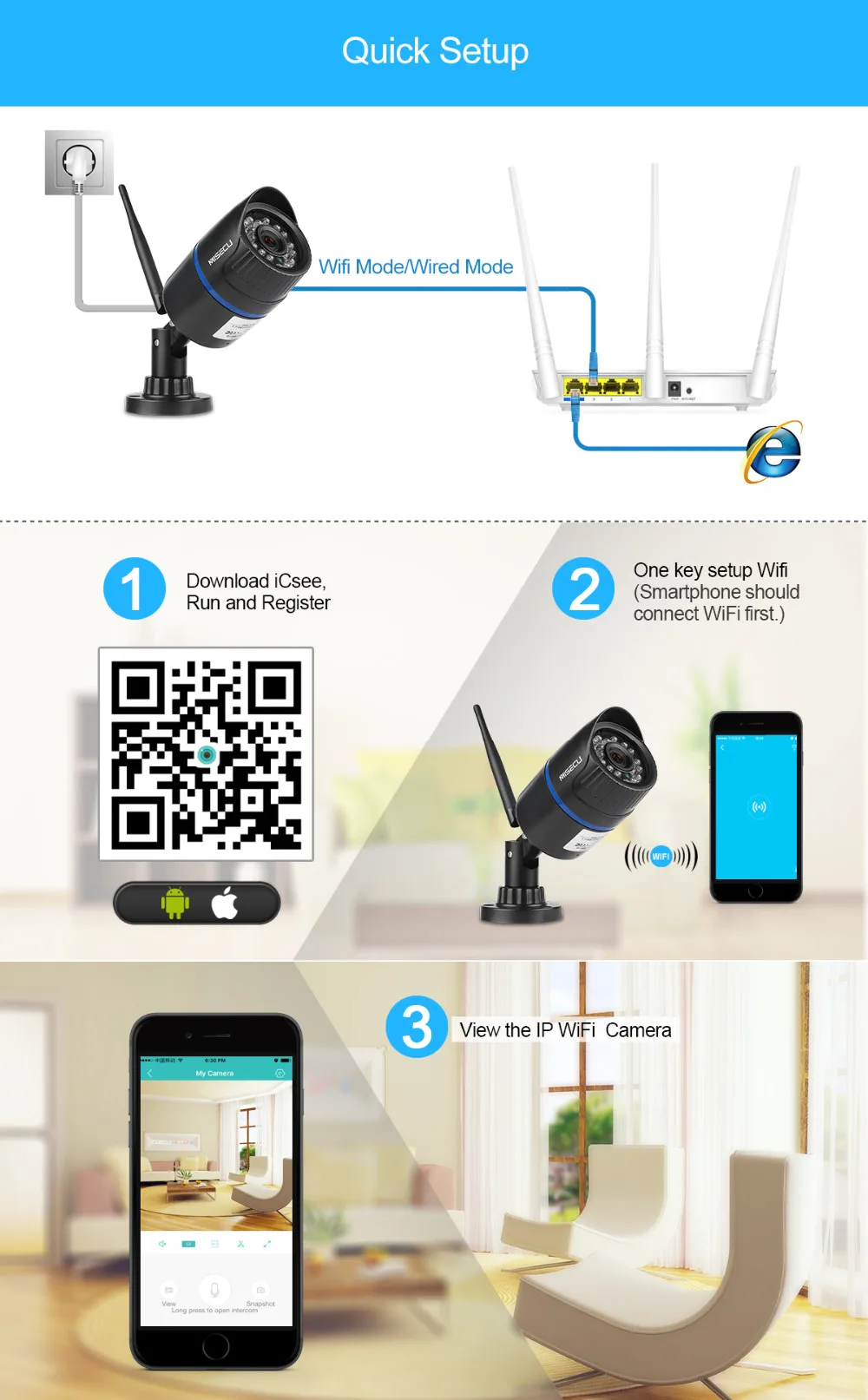 8.Provide free APP: iCsee or XMEye , either is OK . we suggest iCsee , which is more quick set-up.