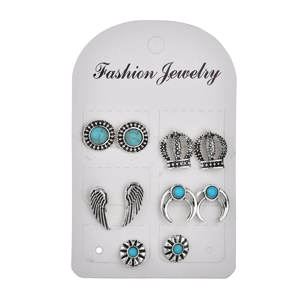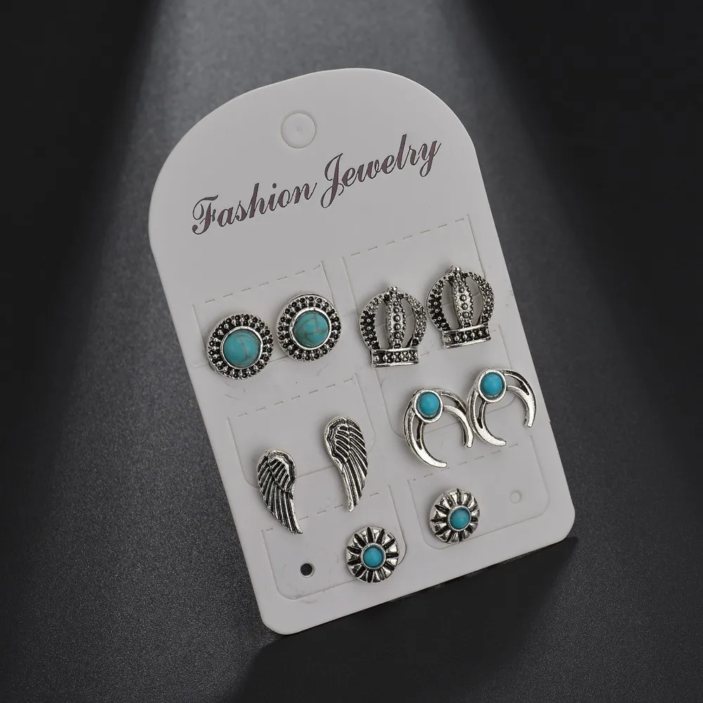 MissCyCy Bohemian 5 Pairs Moon Wing Crown Stud Earrings for Women Vintage Ancient Silver Color Earrings Set Jewelry Gift