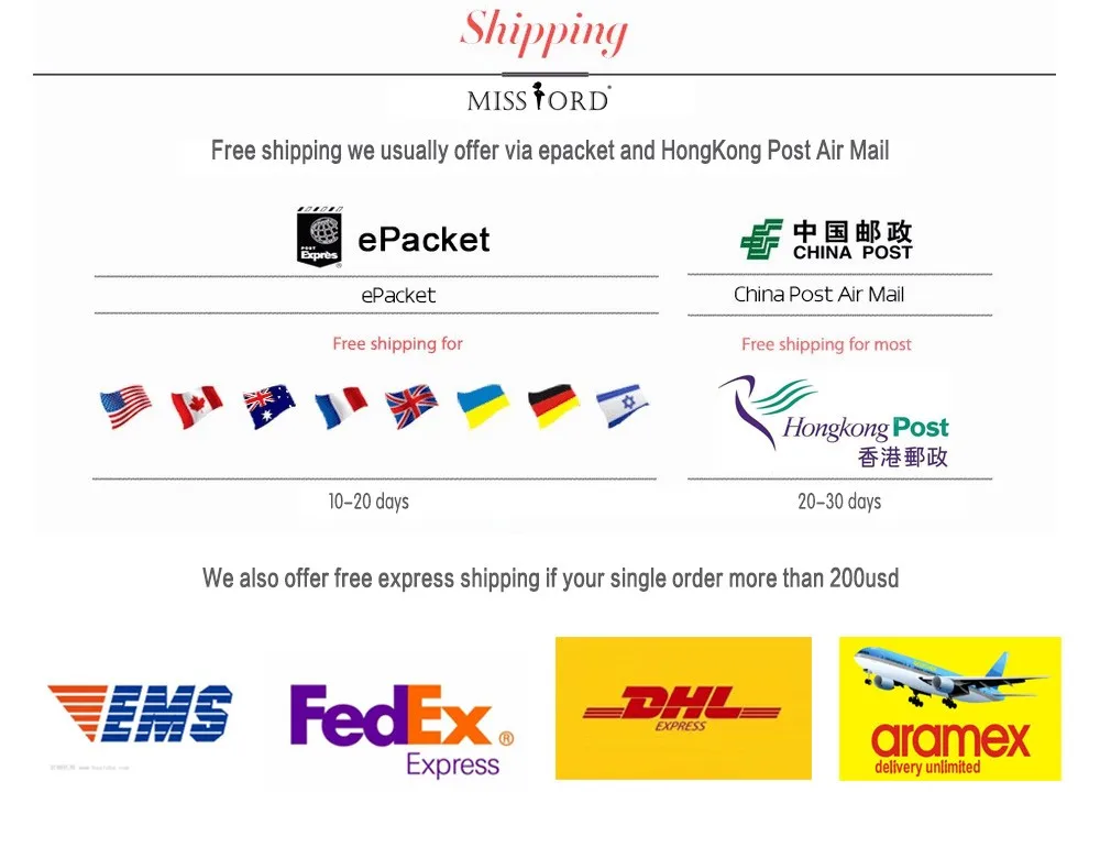 Packages from our warehouse in China will be shipped by ePacket or EMS depending on the weight and size of the product. Packages shipped from our US warehouse are shipped through USPS.