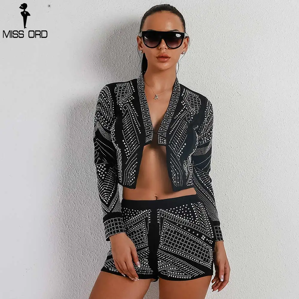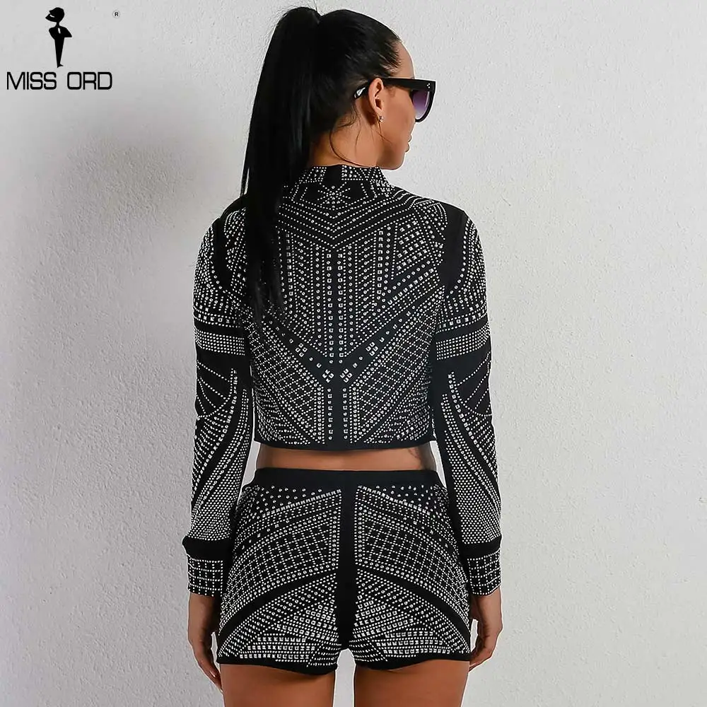 Missord 2018 Summer Sexy Geometry Retro Long Sleeve Two Pcs Set Rhinestone Playsuit TB0019