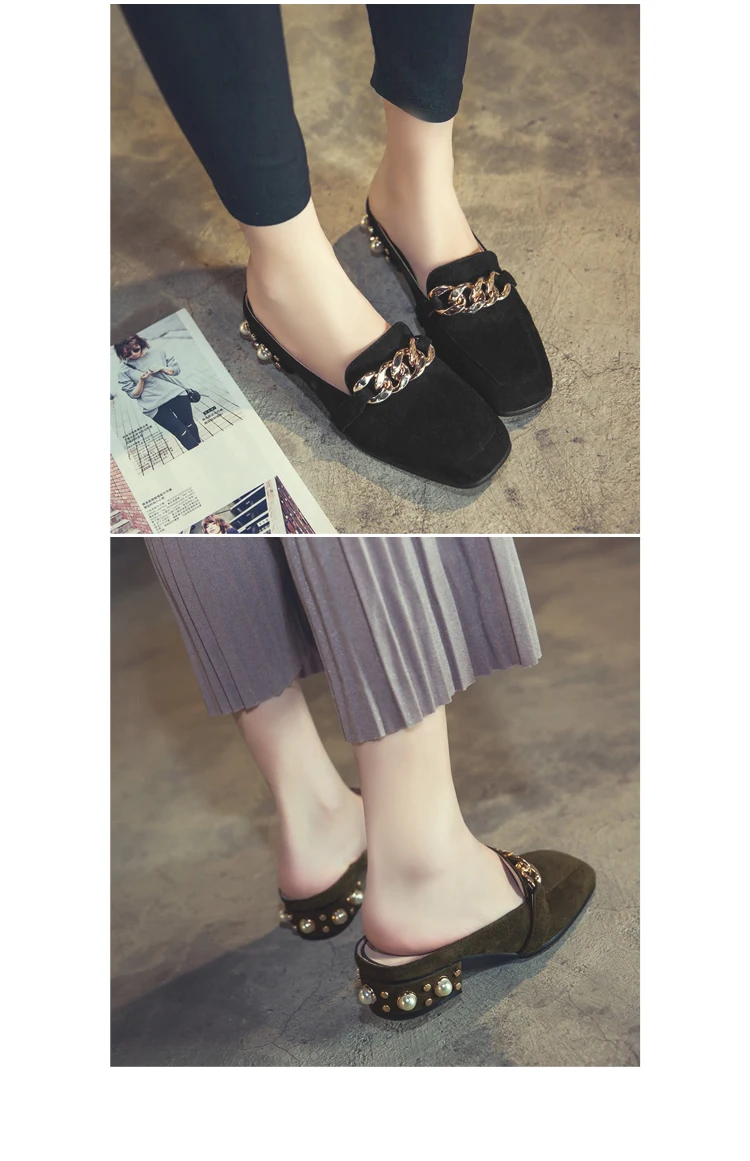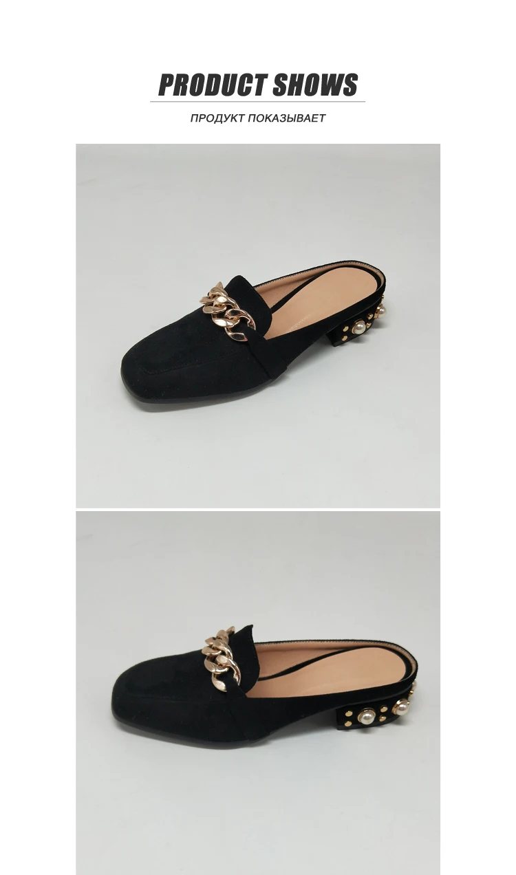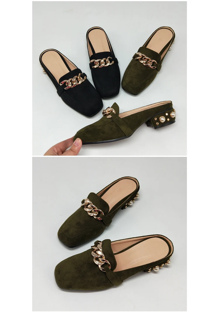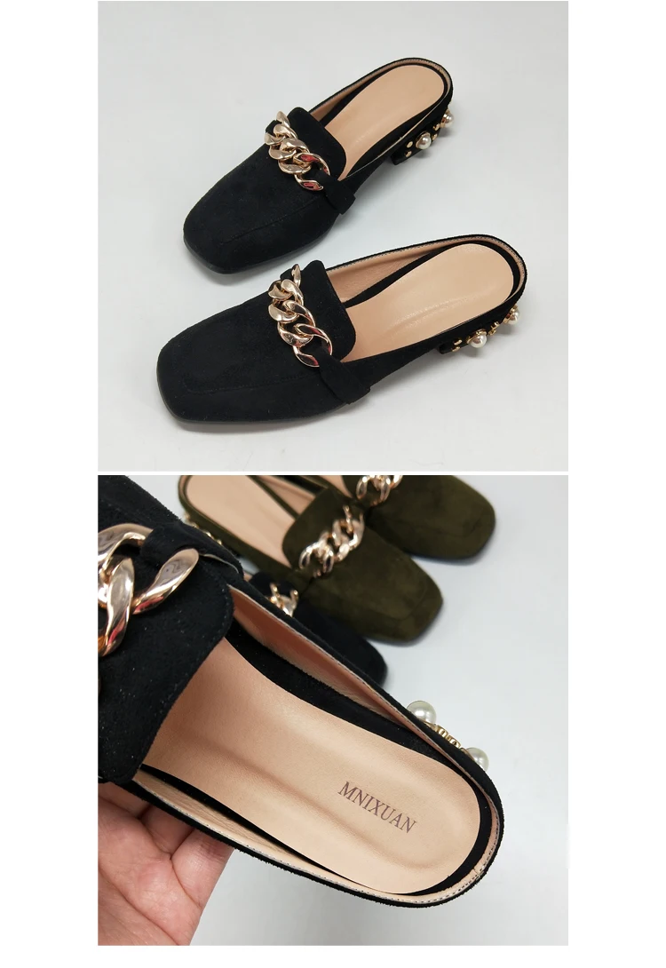 MNIXUAN Fashion new shoes mules women pumps handmade flock square toe thick medium heels 3cm with pearls slip on big size 34-43