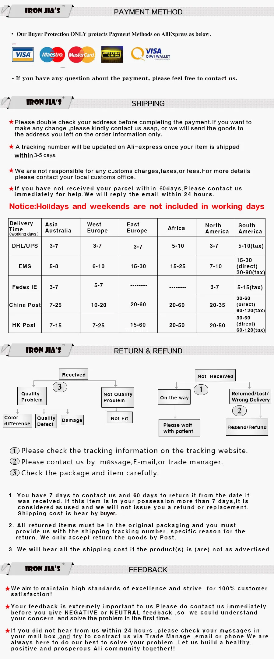 • If you did not receive the product within the guaranteed time( 45 days not including 2-5 day processing) you can request a refund or a reshipment.