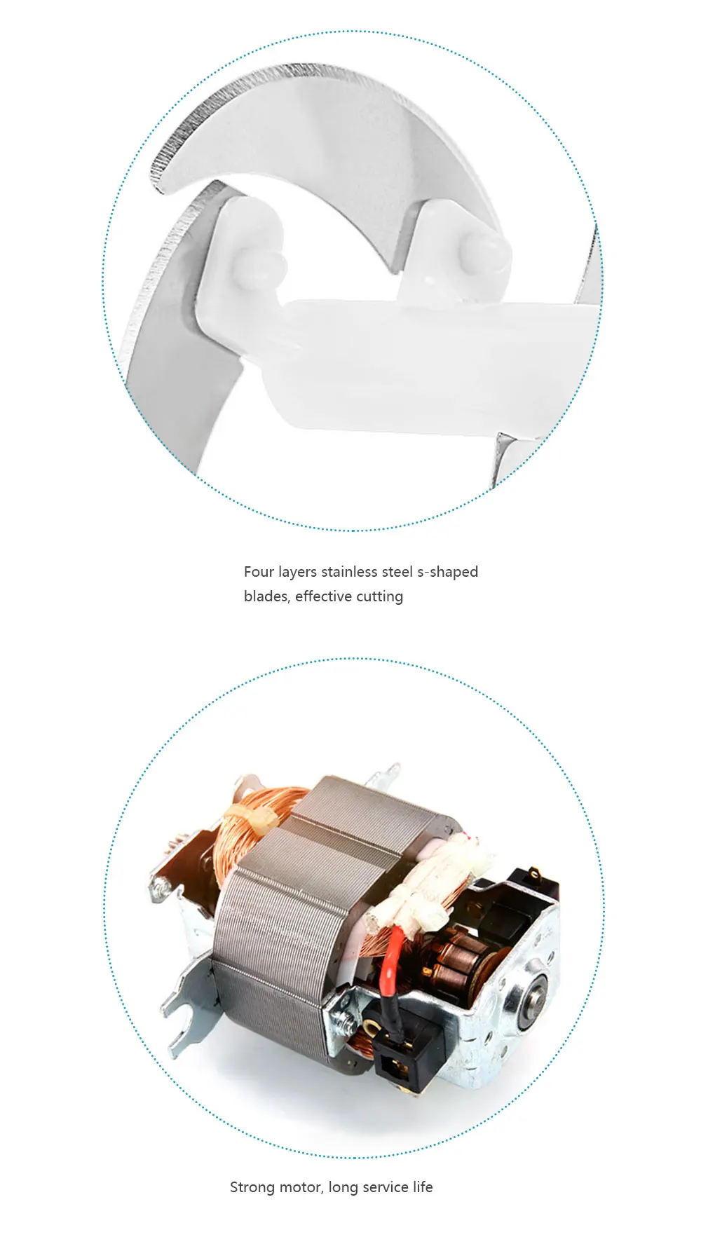 – Quick: the 4 stainless steel blades are sharpened, powerful and solid, they can mince different foods in a very short time, save your cutting time