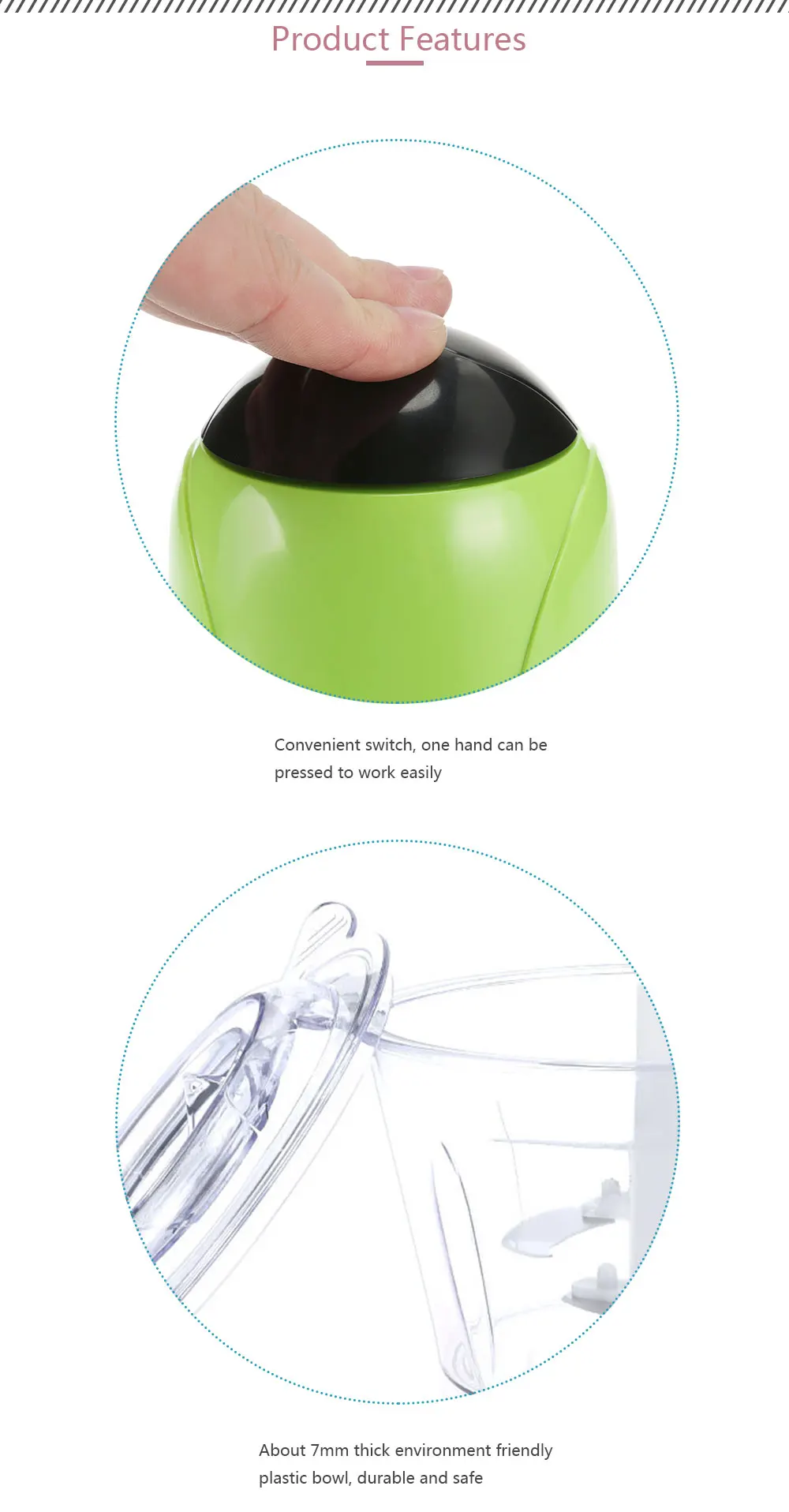 – Safe: with it, you have no need to use the kitchen knife. Just press the button and the food can be chopped in several seconds